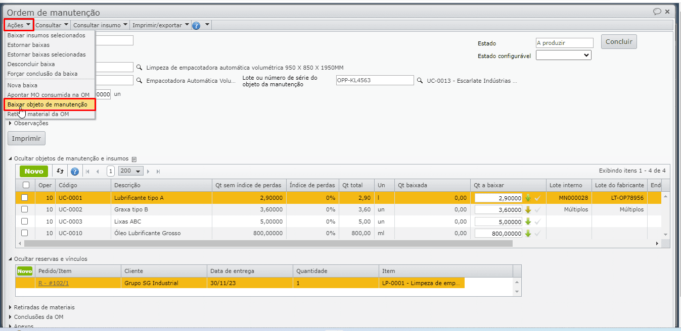 2) Para baixar o objeto de manutenção, entre na edição da OM e acesse o submenu “Ações > Baixar objeto de manutenção”.