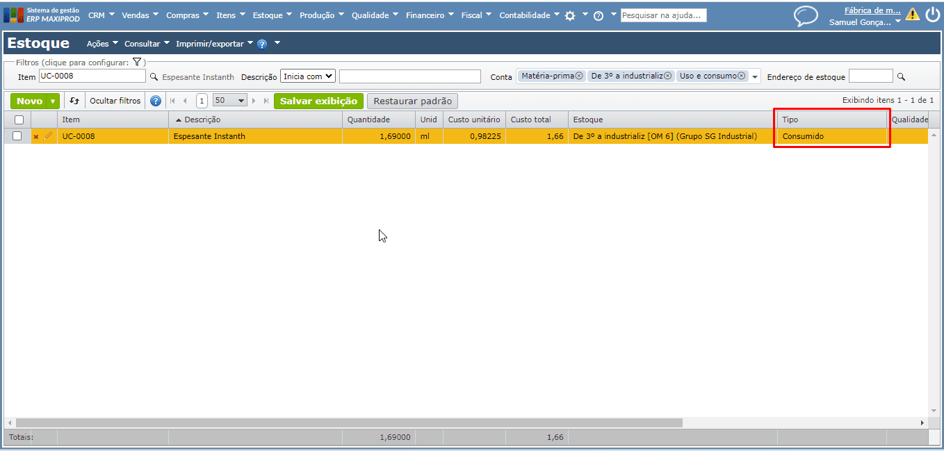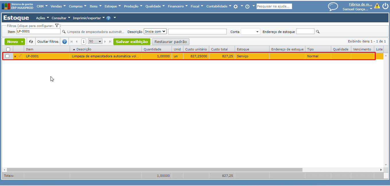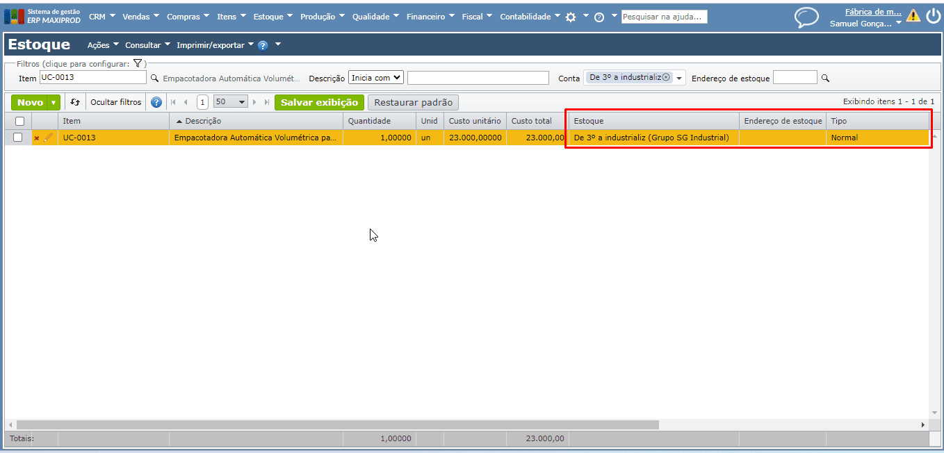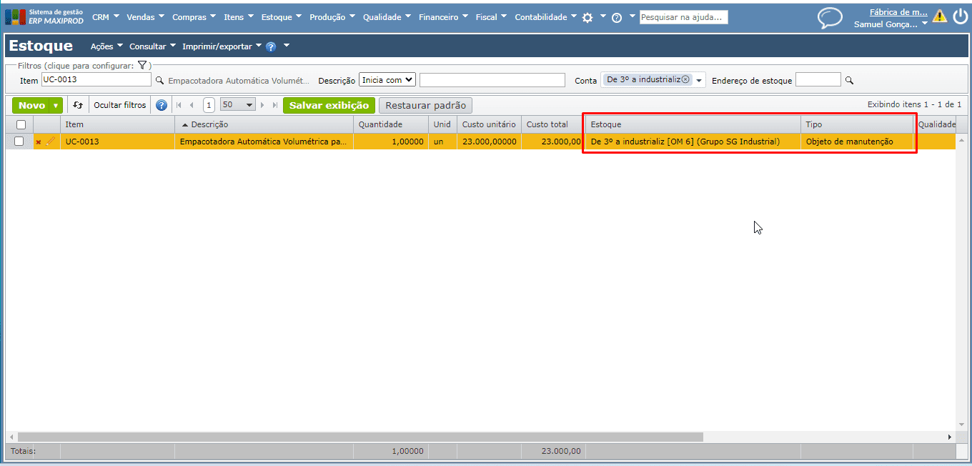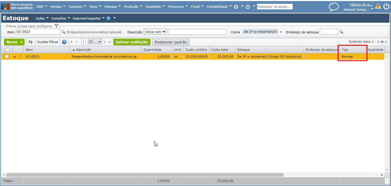 5) Observe que, antes da baixa, o objeto de manutenção estava em um estoque do tipo “Normal”.