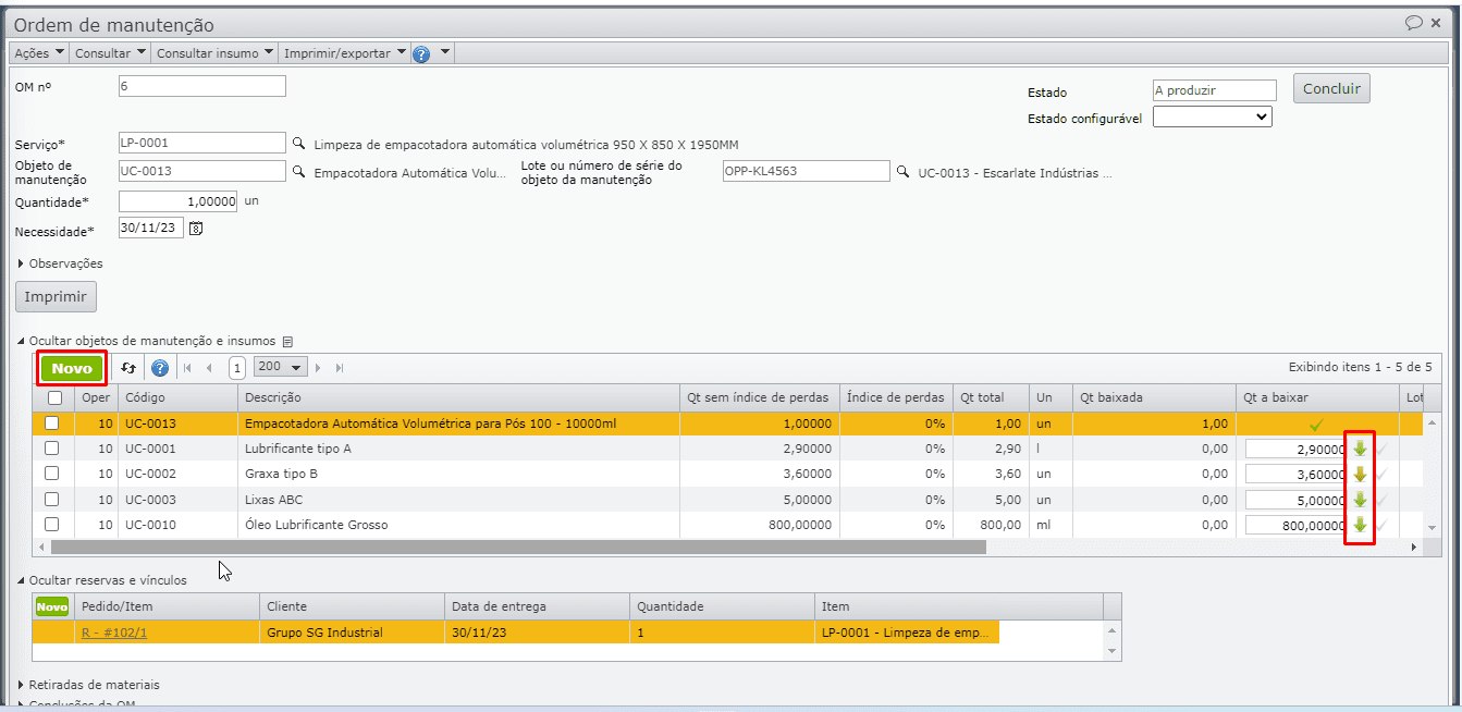 2) Para baixar insumos para a OM (além do objeto de manutenção), entre na tela de edição da OM. Na seção “Objetos de manutenção e insumos”, clique na flecha verde para baixar os insumos cadastrados ou clique no botão verde “Novo” para baixar insumos não cadastrados previamente.
