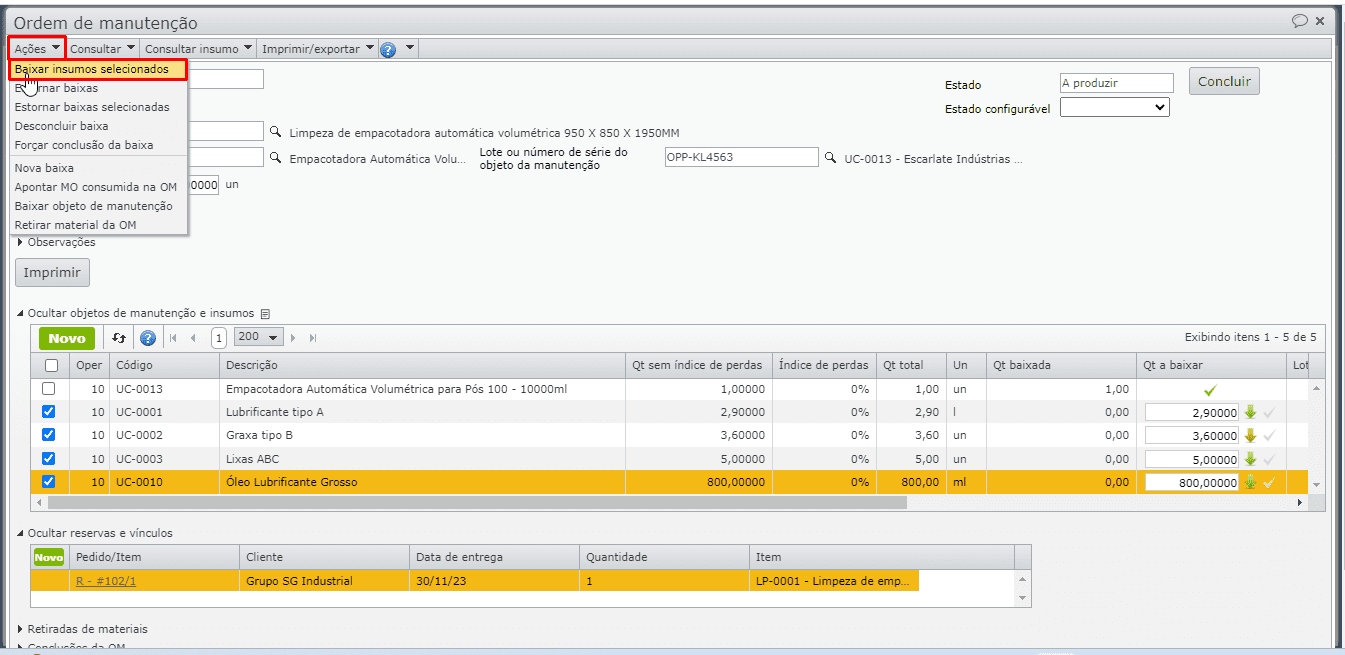 - Manter insumo consumido em estoque separado: o estoque, após consumido, é movimentado para um estoque de “material consumido”. Isto é útil quando é necessário detalhar os insumos consumidos na OM, por exemplo na NF de devolução para o cliente. Veja na imagem abaixo um exemplo de insumos baixados com essa opção: