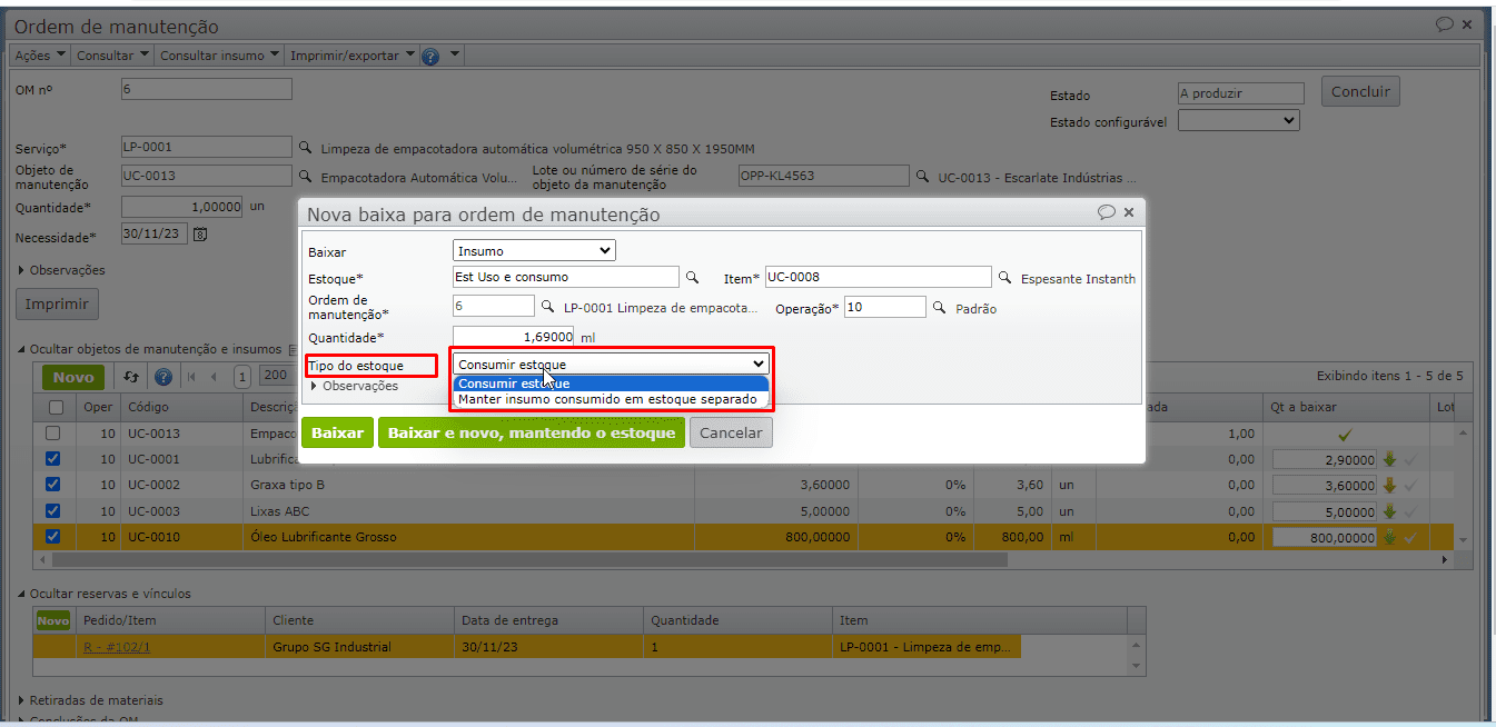 4) O último campo dessa janela de baixa se chama “Tipo do estoque”. Defina se o insumo deve ser apenas consumido pela OM, ou se este insumo, após consumido, deve ser mantido em um estoque separado, visando a devolução fiscal (caso tenha sido fornecido pelo cliente).