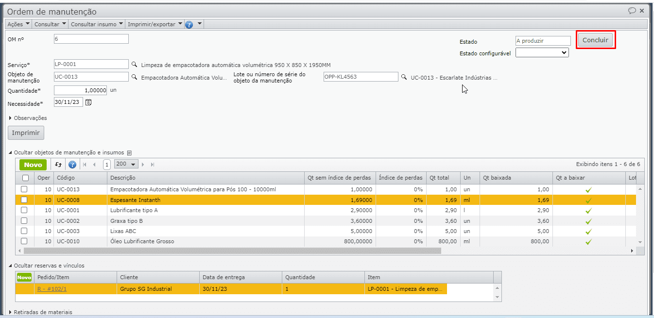1) Após as baixas e apontamentos da OM, conclua-a clicando no botão “Concluir” no canto superior direito da janela de edição.