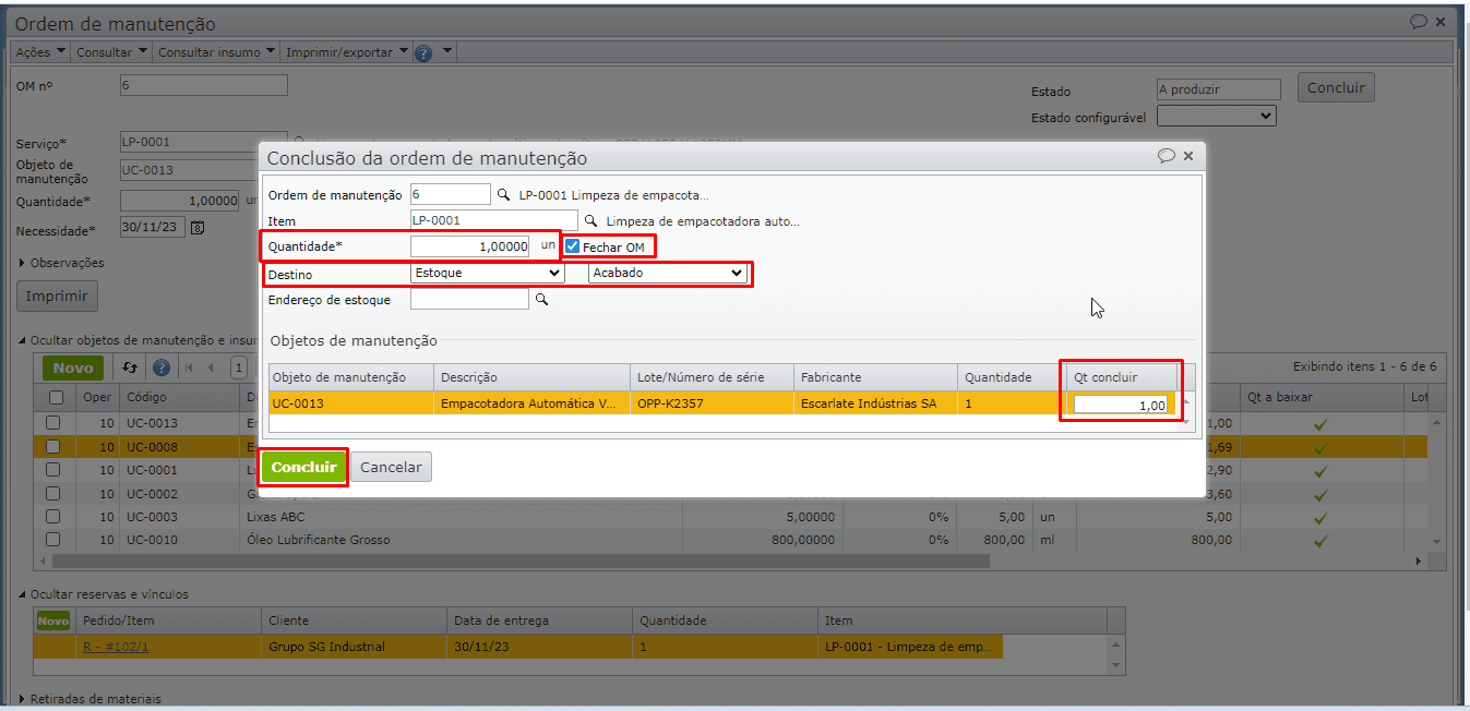 2) Será aberta uma janela para informar a quantidade do item ‘serviço de manutenção’ sendo concluído se deseja fechar a OM, o estoque/conta de destino e a quantidade concluída de cada objeto de manutenção baixado anteriormente. Para efetivar a movimentação utilize o botão verde “Concluir”.