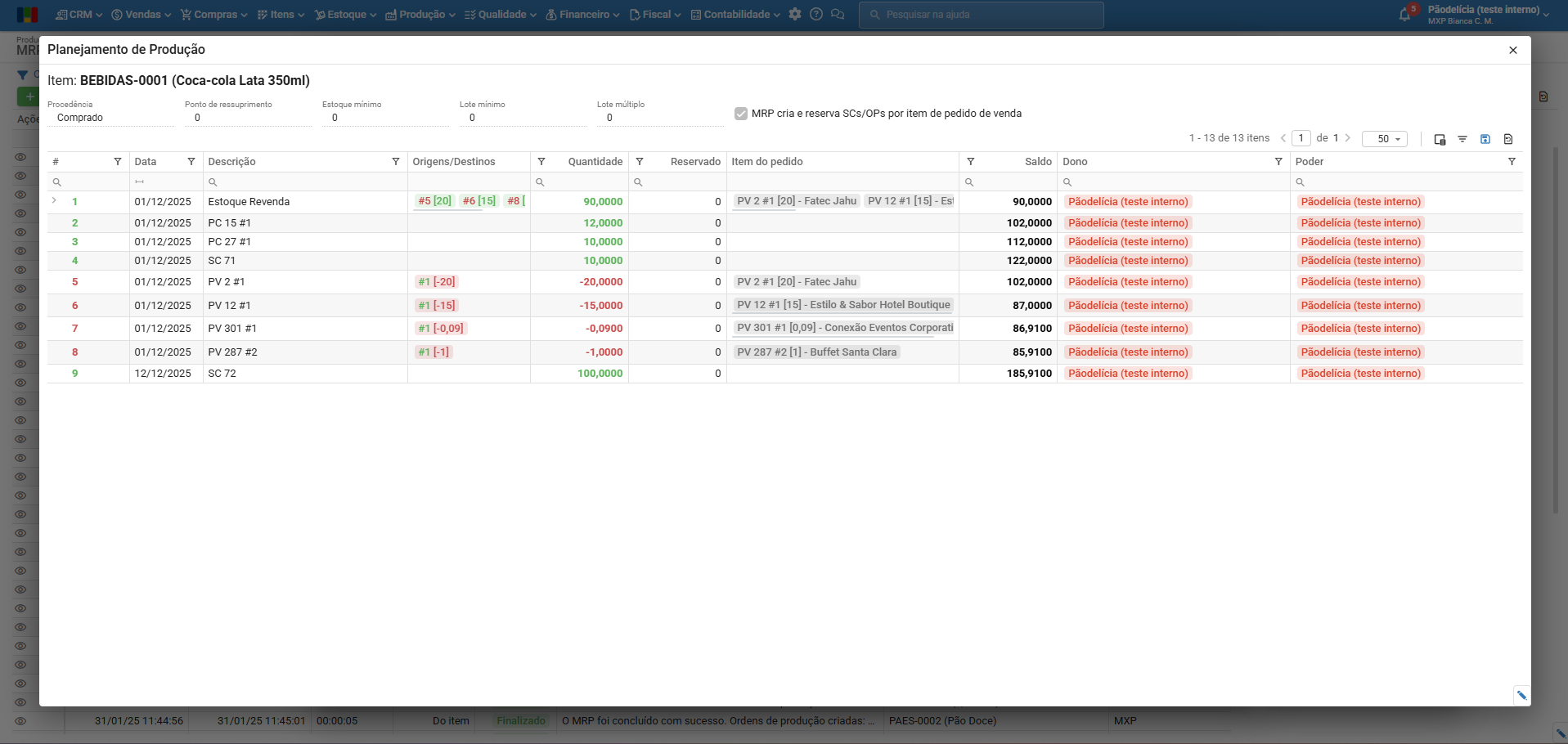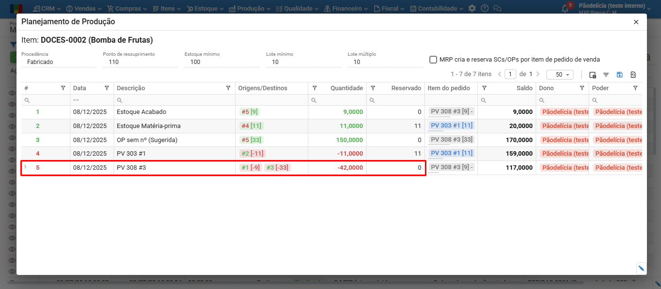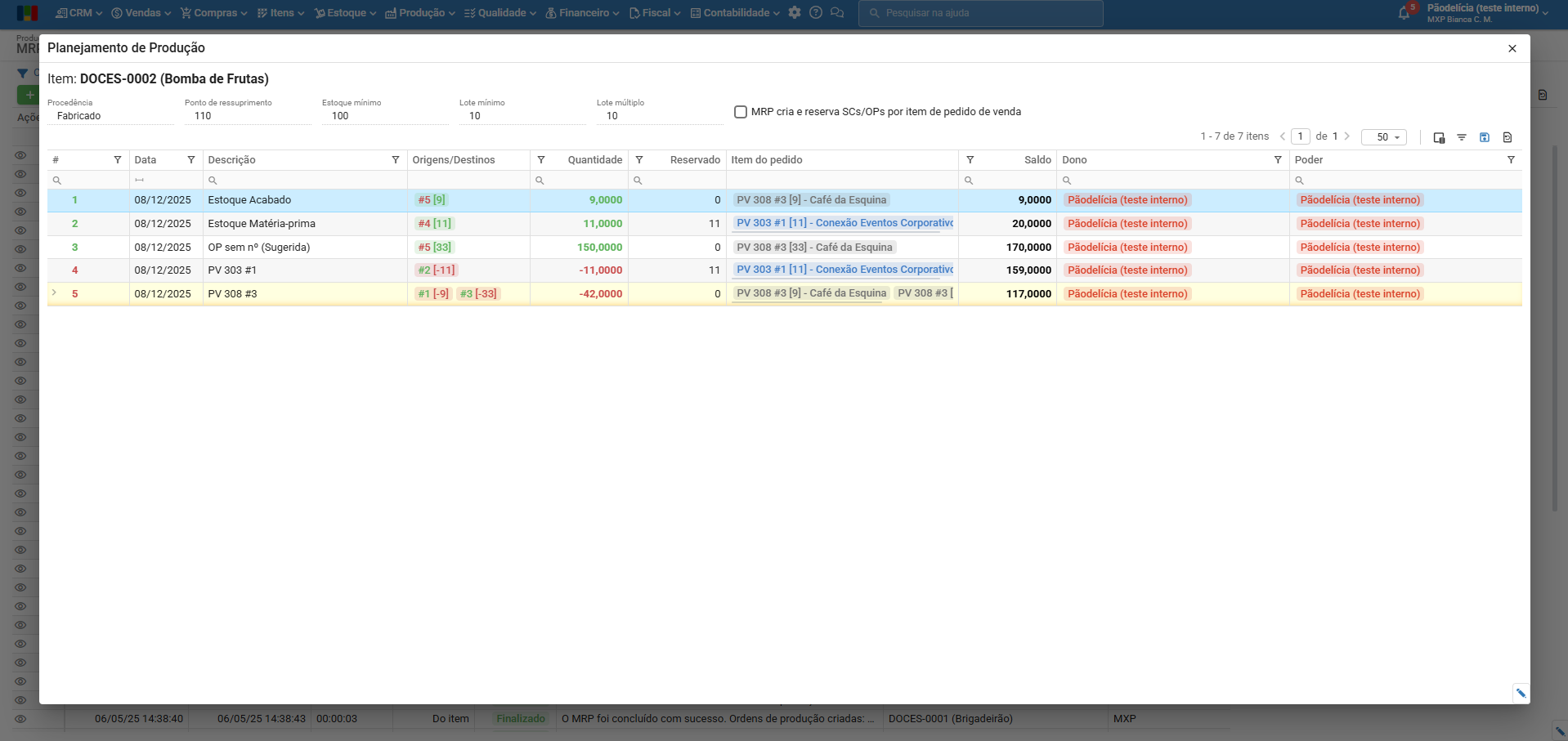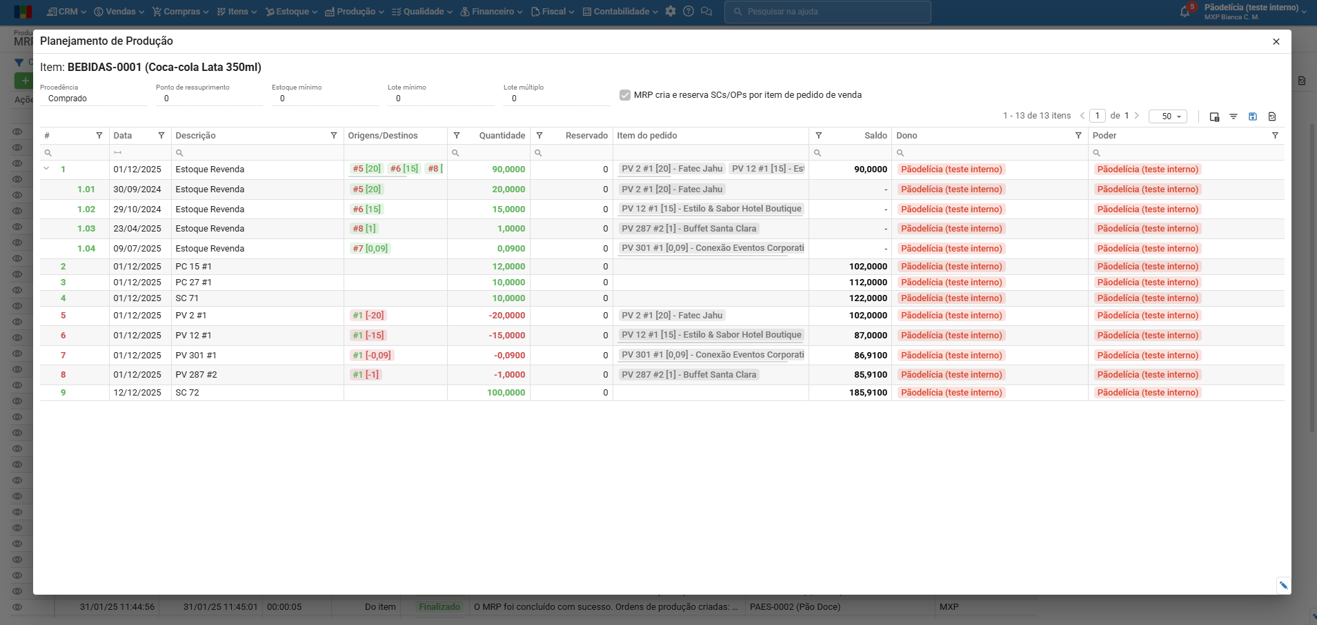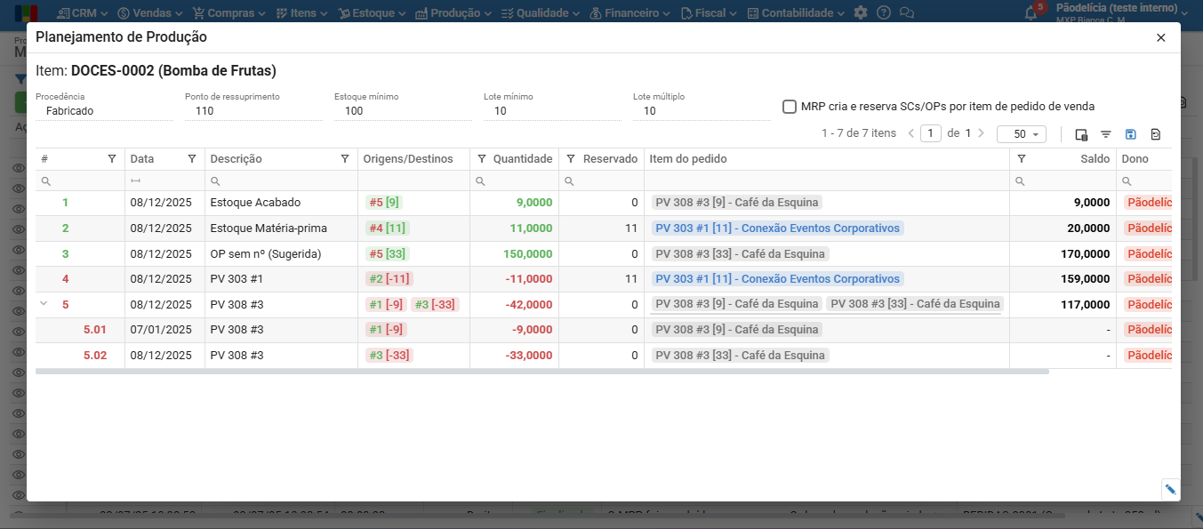 - 11 un estão na conta de estoque “Matéria-prima”, reservadas para o item #1 do pedido 303 para o cliente “Conexão Eventos Corporativos”.