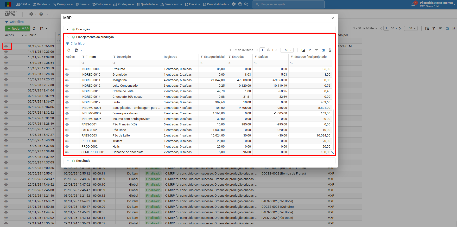 1) Para encontrar a projeção de estoque, acesse o menu “Produção > MRPs” e visualize uma execução do MRP através do ícone “olho”.