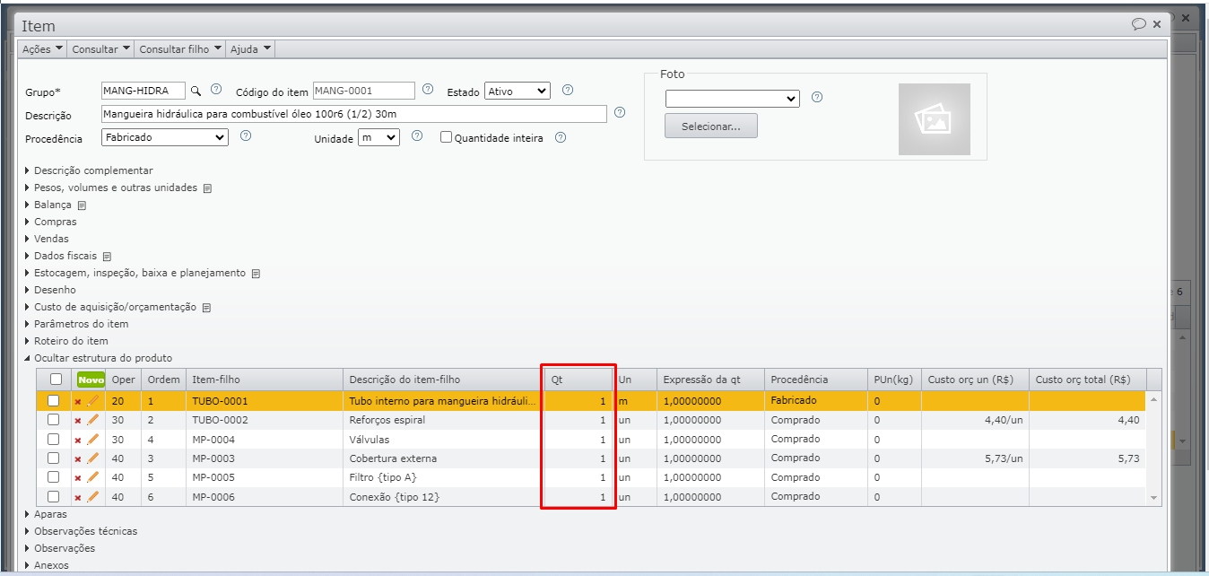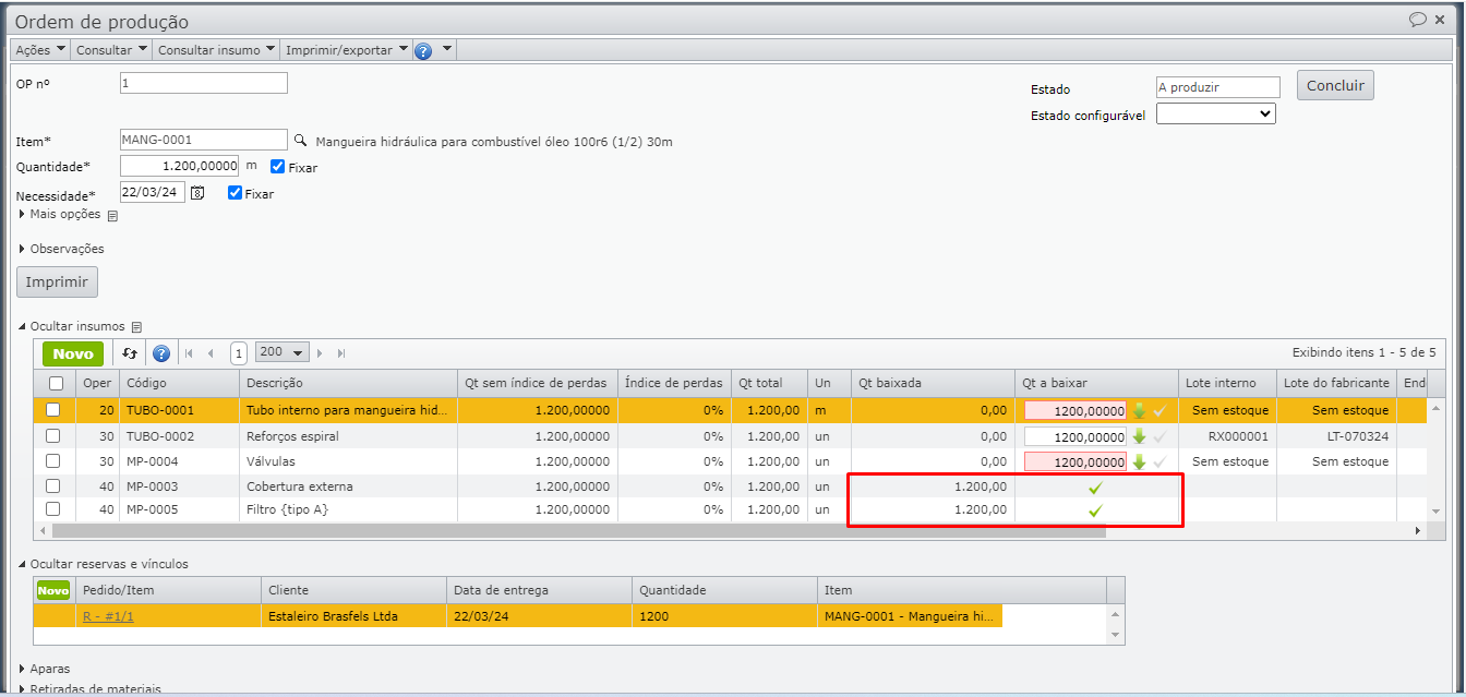 3) Se o usuário altera a quantidade do item-filho na estrutura de produto e, a baixa deste insumo estiver concluída na OP ainda não concluída, a alteração da quantidade na estrutura de produto não se refletirá na grade de insumos.