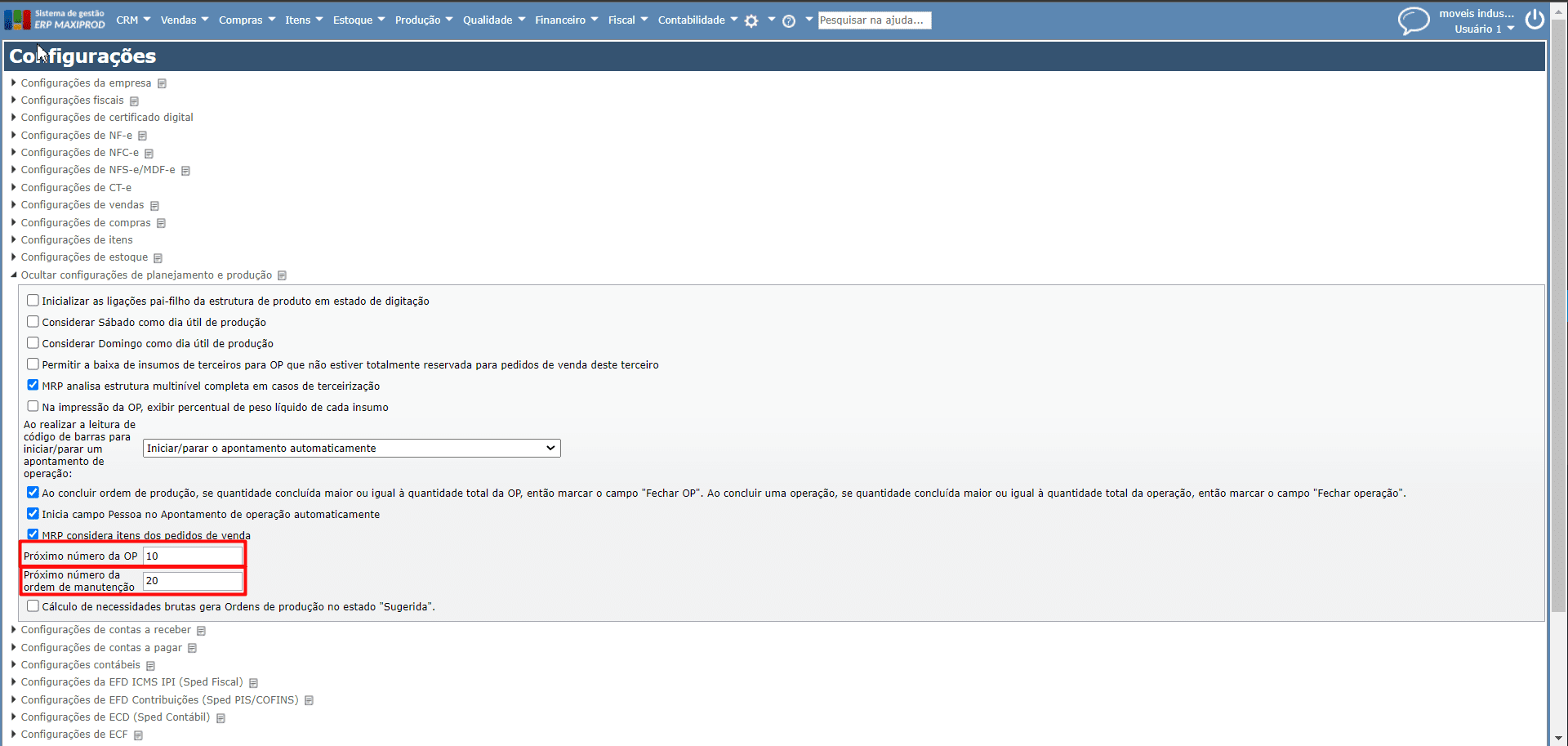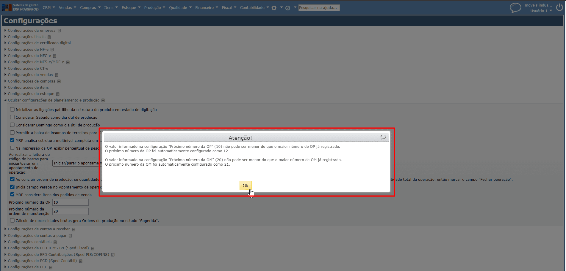 O valor informado na configuração “Próximo número da OP/OM” (**) não pode ser menor do que o maior número de OP/OM já registrado.