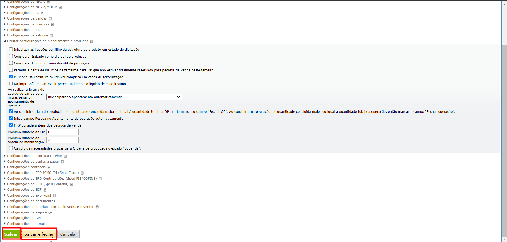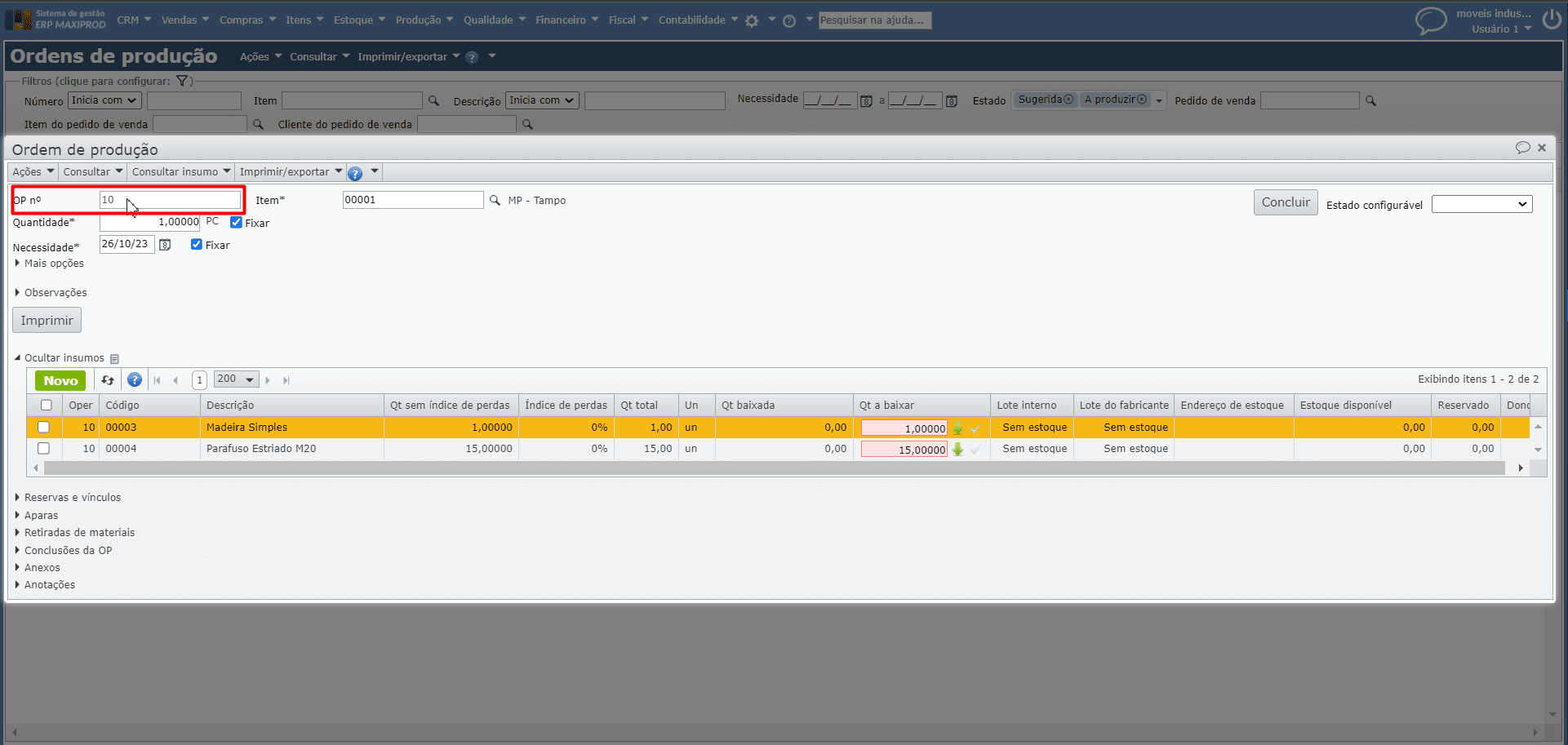 Observação: se o número informado no campo “Próximo número da OP” é “10”, a próxima OP será inicializada com o número “10”. A OP seguinte será a “11”, e assim por diante. Isto também se aplica às OMs.