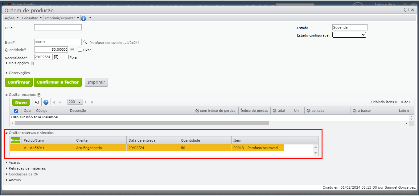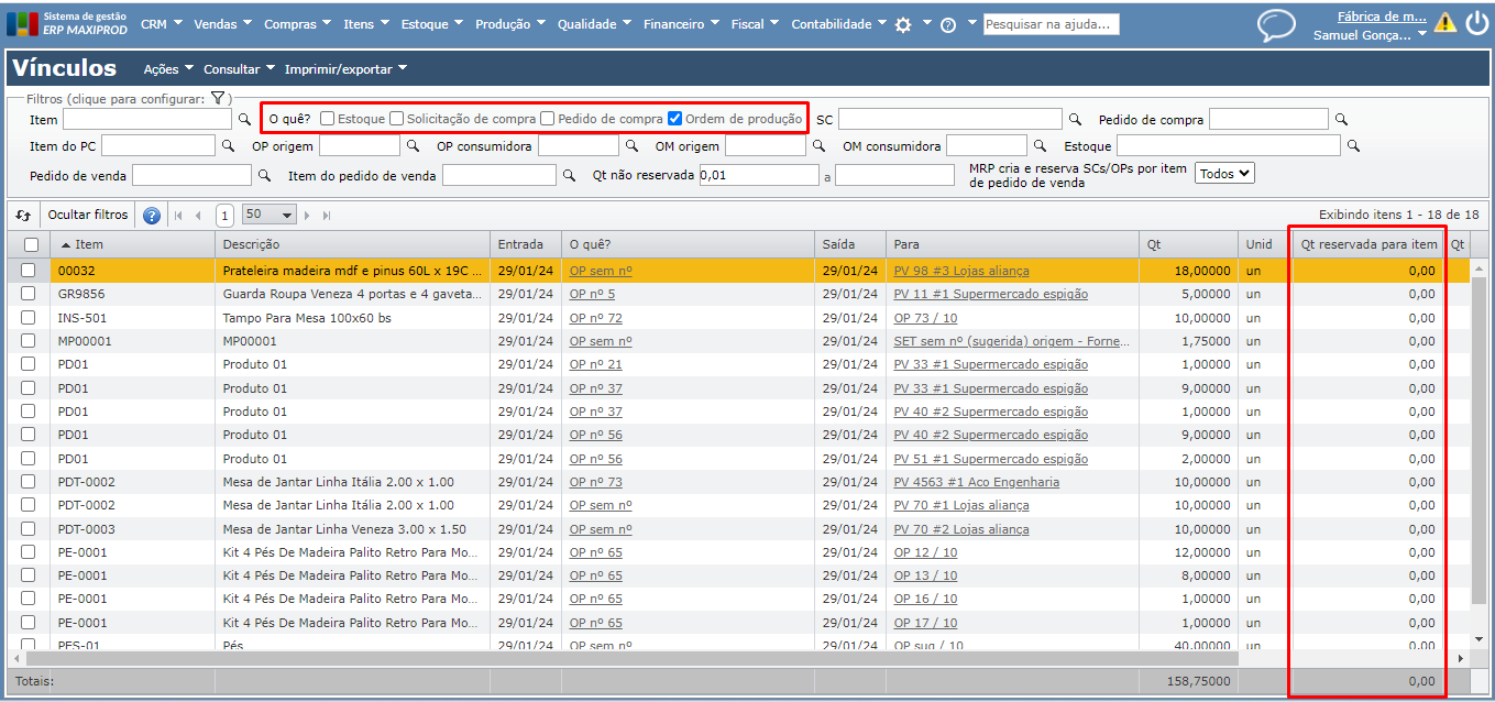 3) Somente é possível consultar as reservas já atendidas de uma ordem de produção, quando elas existiram. Ou seja, se houve apenas vínculos entre uma ordem de produção e um pedido de venda, estes vínculos são transferidos para o estoque após a conclusão da ordem de produção, sem se converter em reservas.