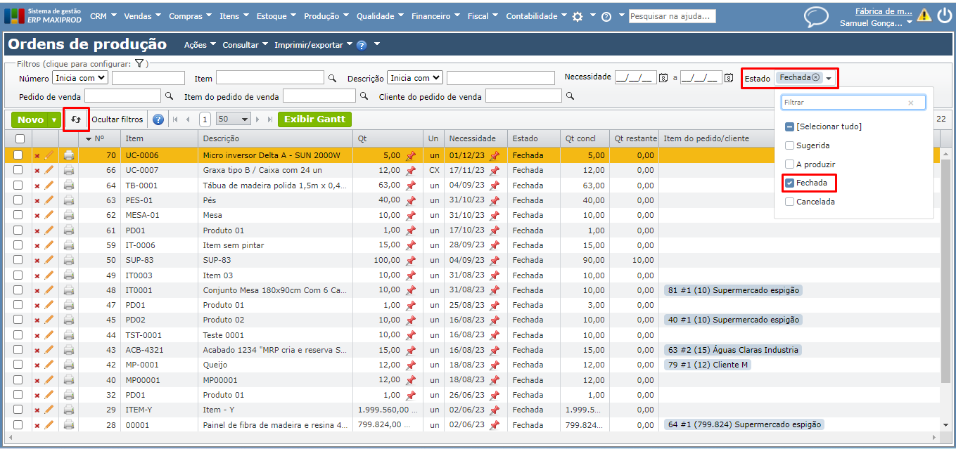 2) Para consultar OPs já no estado “Fechada”, acesse o menu superior “Produção > Ordens de produção” e, na tela aberta, selecione apenas a opção “Fechada” do filtro “Estado”. A seguir, atualize a tela.