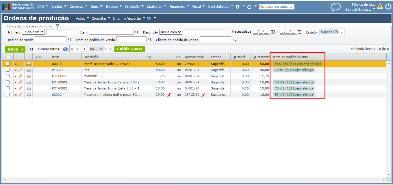 4) Na coluna “Item do pedido/cliente” da grade de ordens de produção, os vínculos são exibidos em verde, as reservas não atendidas em azul e as reservas atendidas em preto. Veja abaixo como são mostrados os vínculos não reservados.