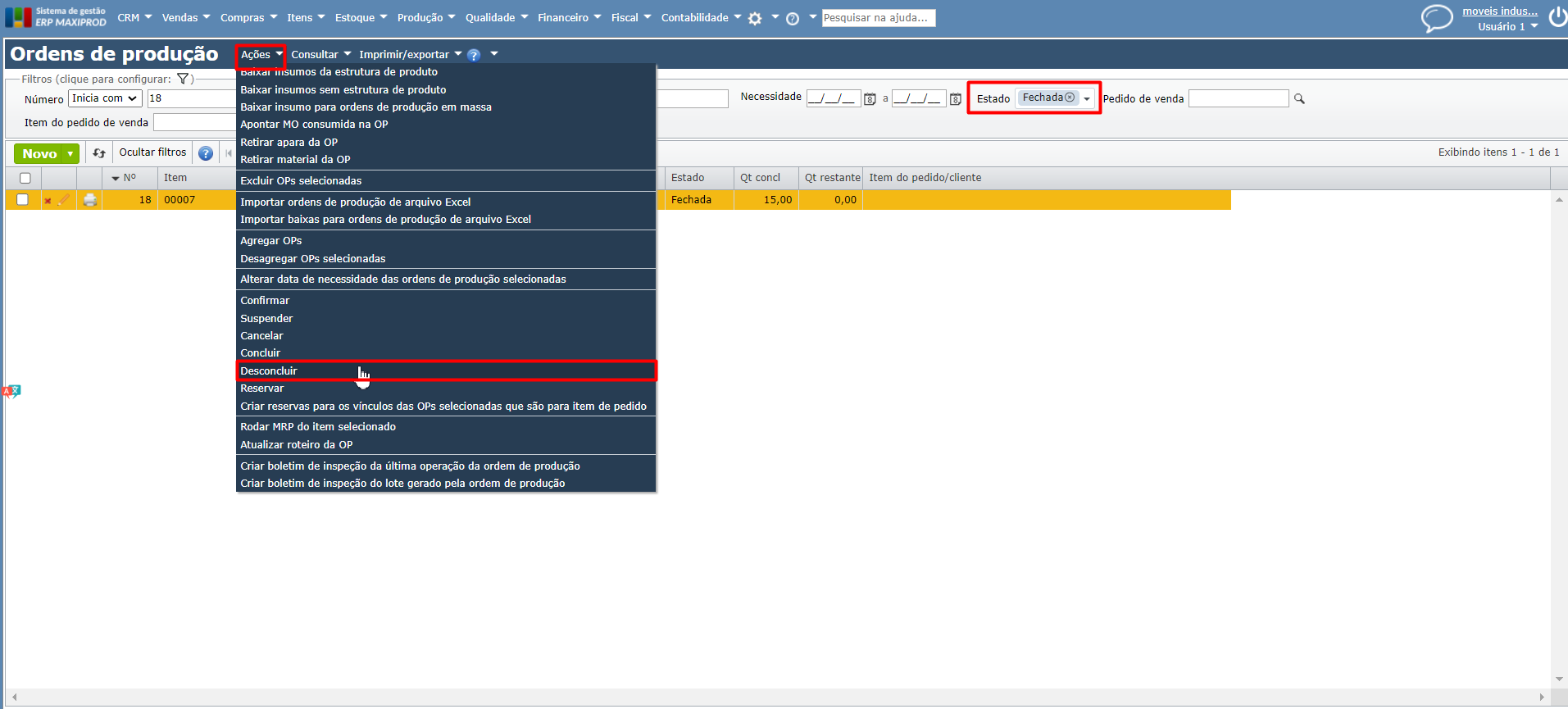 3) Selecione “Fechada” no filtro “Estado”, procure a OP concluída, clique nela e acesse o menu “Ações > Desconcluir”.