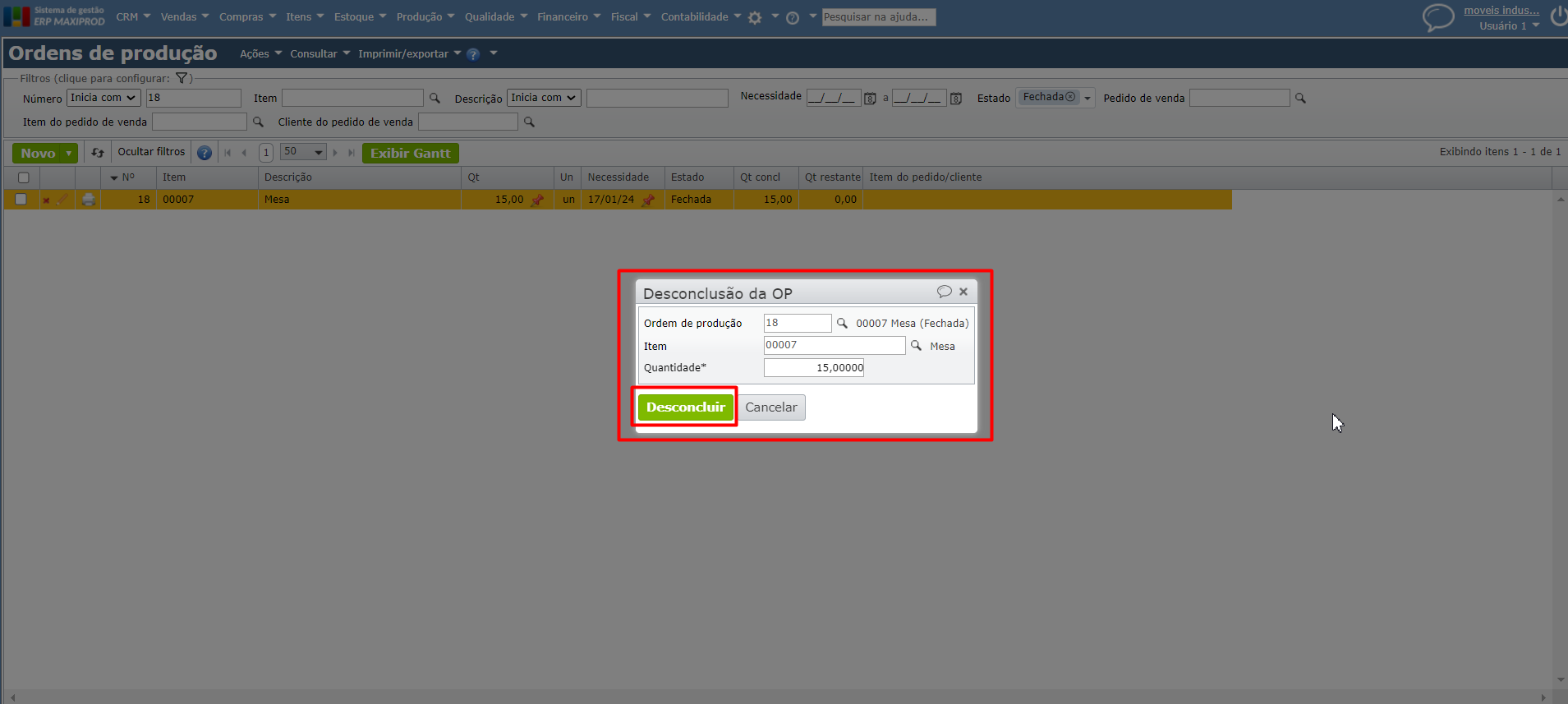 4) É aberta a tela de “Desconclusão da OP“, onde a quantidade sugerida é a quantidade total concluída. Clique no botão verde “Desconcluir” para confirmar.