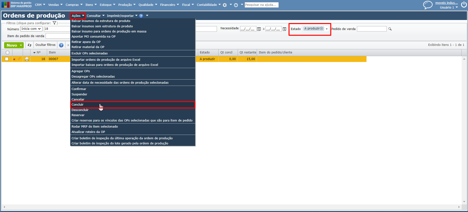 5) Selecione “A produzir” no filtro “Estado”, identifique a respectiva OP, clique sobre ela e acesse o menu “Ações > Concluir”.