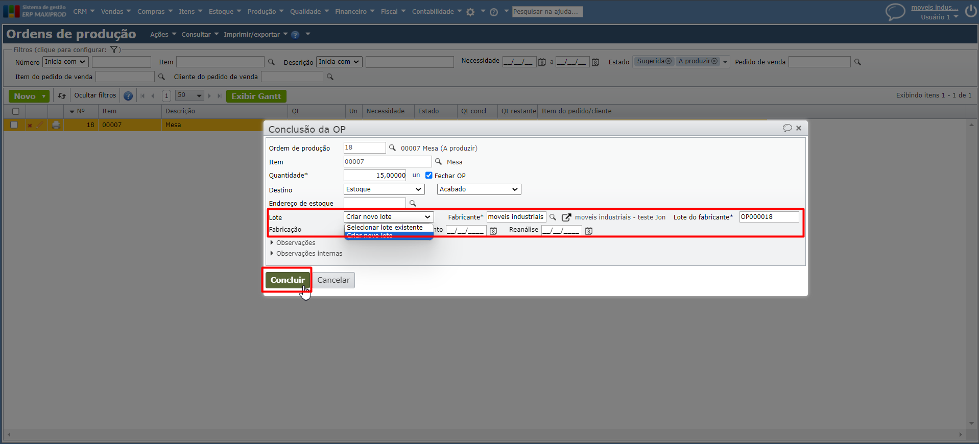 6) Na tela de conclusão da OP, informe a quantidade, o “Destino” e insira as informações do lote. Após inserir, clique no botão verde “Concluir”. Dessa forma, o item terá seu registro no devido lote.