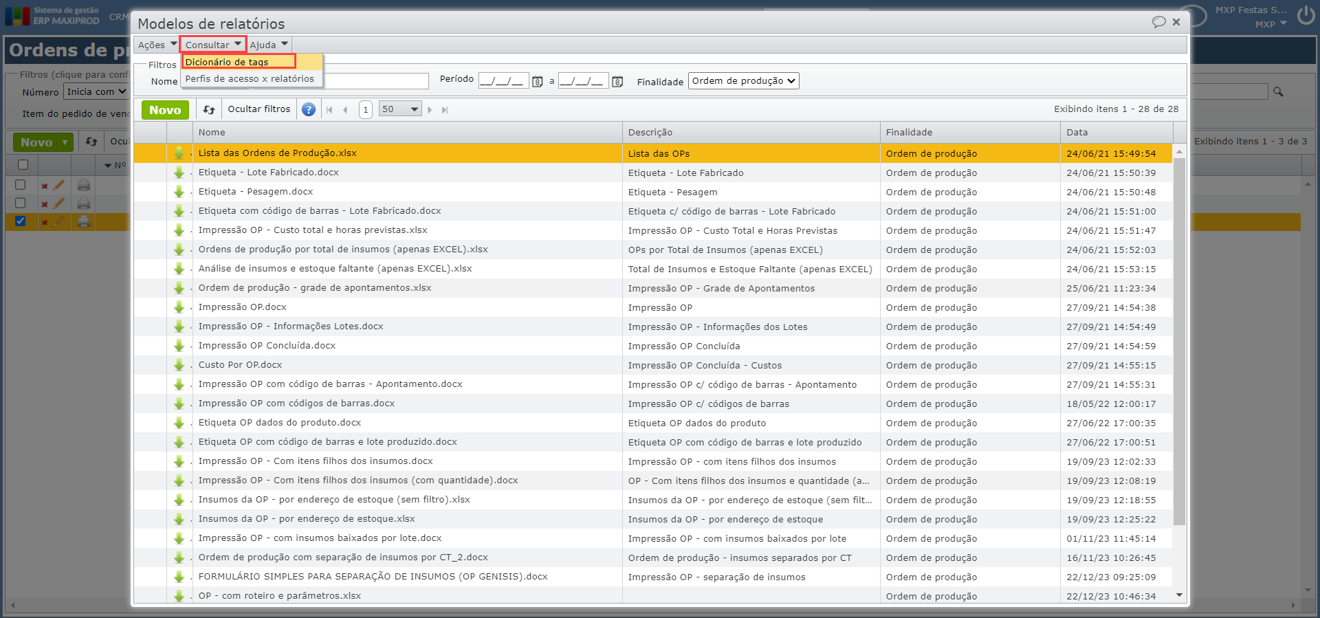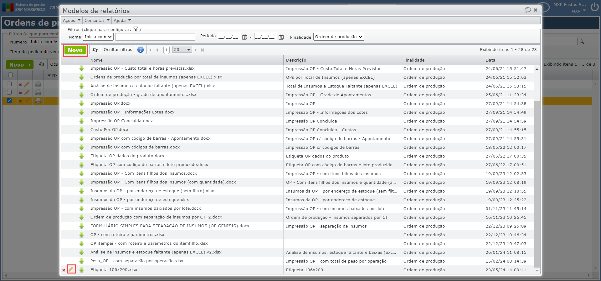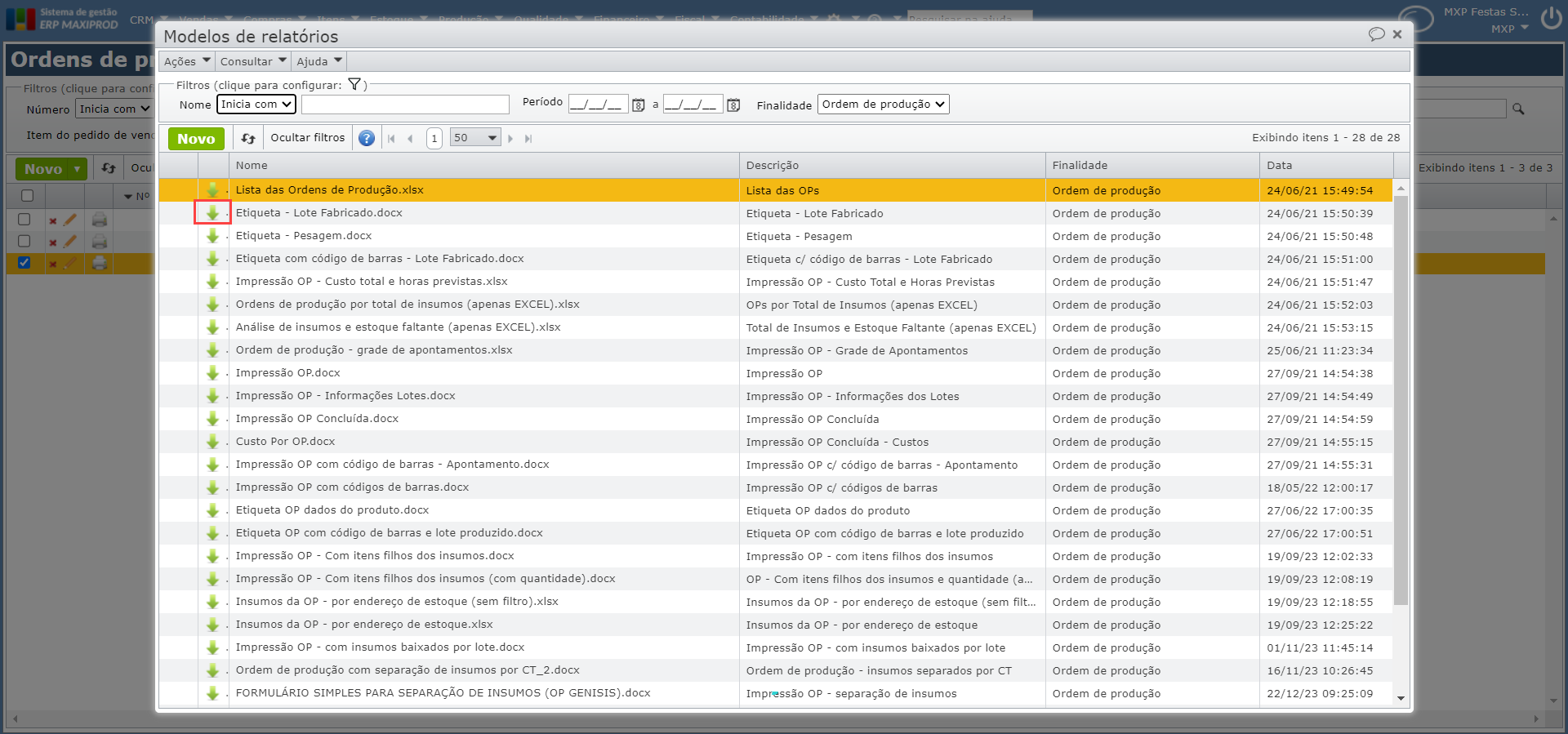 O ERP MAXIPROD permite a criação e alteração de relatórios padrão e personalizados existentes no sistema. Desta forma, pode-se alterar a forma de impressão de ordens de produção, exportando seus dados para arquivos Word, Excel ou baixando-os em PDF.