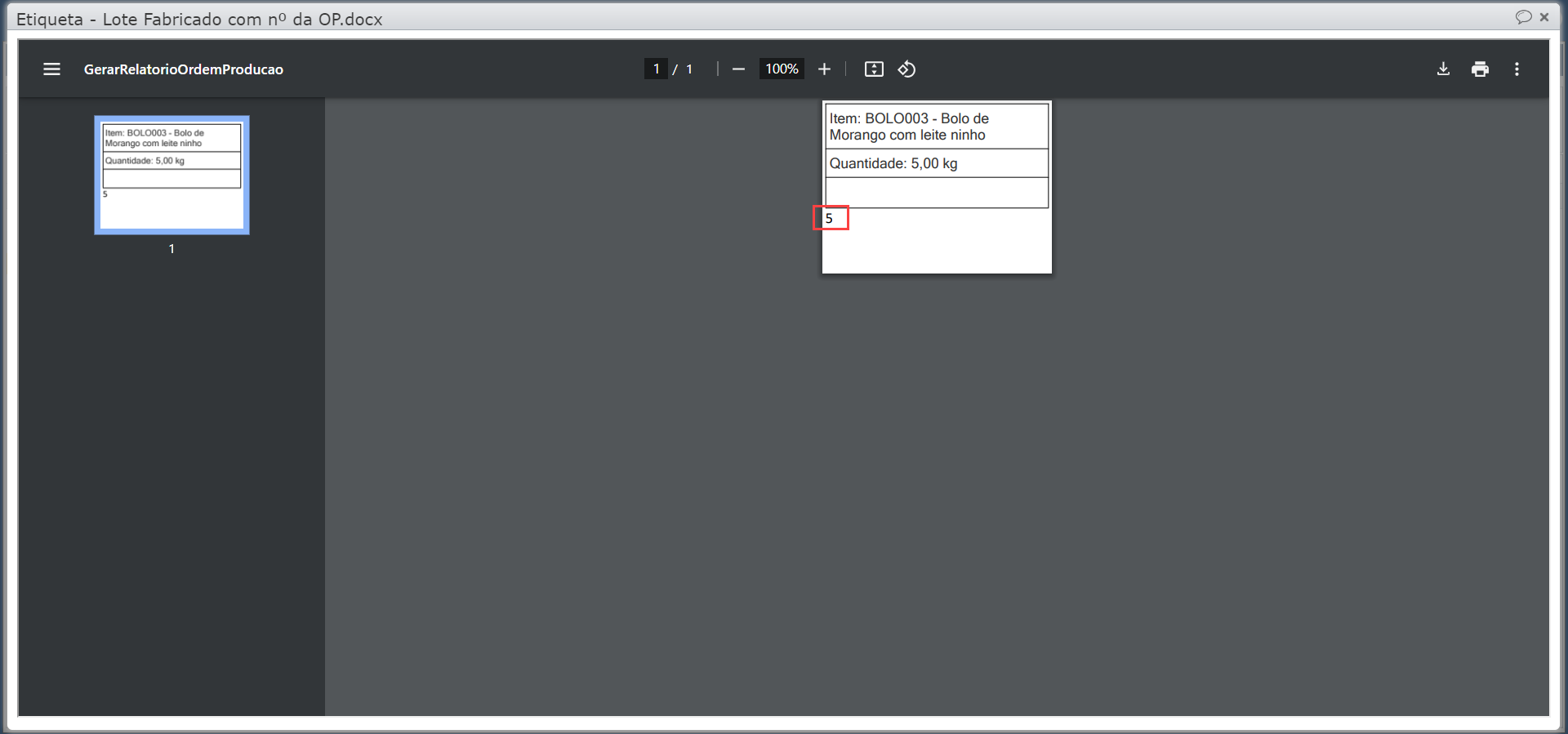 - Exemplo do relatório com a inclusão da tag “[[OrdemProducao.Numero]]”: