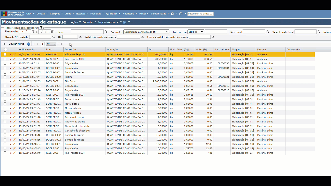2) Esta tela mostra as movimentações de todos os itens. Para ver os totais produzidos por ordens de produção, utilize o filtro “Operações”, selecionando a opção “Quantidade concluída da OP”.