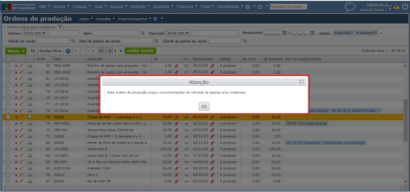 1) Esta mensagem é exibida quando o usuário tenta excluir uma ordem de produção (OP) que tem movimentações de aparas ou retirada de materiais: