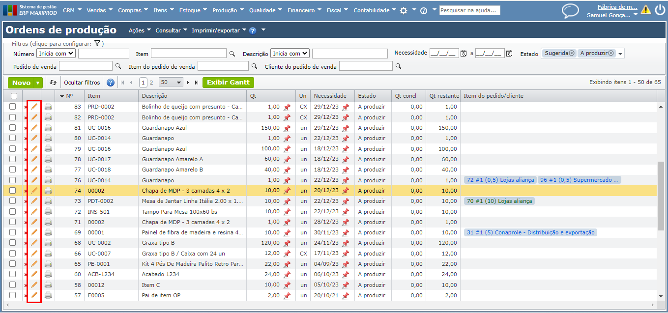 2) Clique em “Ok” na mensagem apresentada em tela. Para ver estas movimentações, acesse a janela de edição da OP, clicando no ícone do lápis na linha da respectiva OP.
