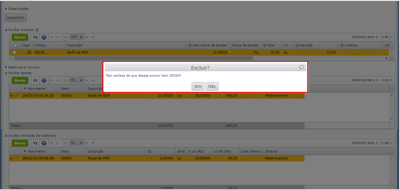 5) Clique em “Sim” para confirmar a exclusão da movimentação. O sistema verificará se não há mais impeditivo para a exclusão e, se não houver, fará a exclusão.