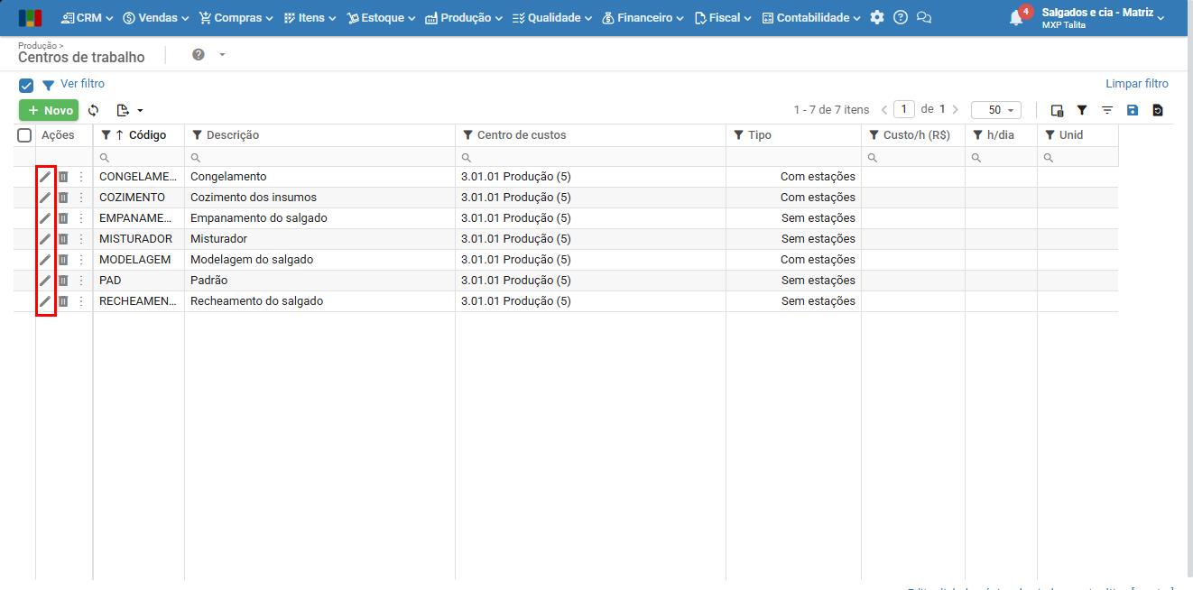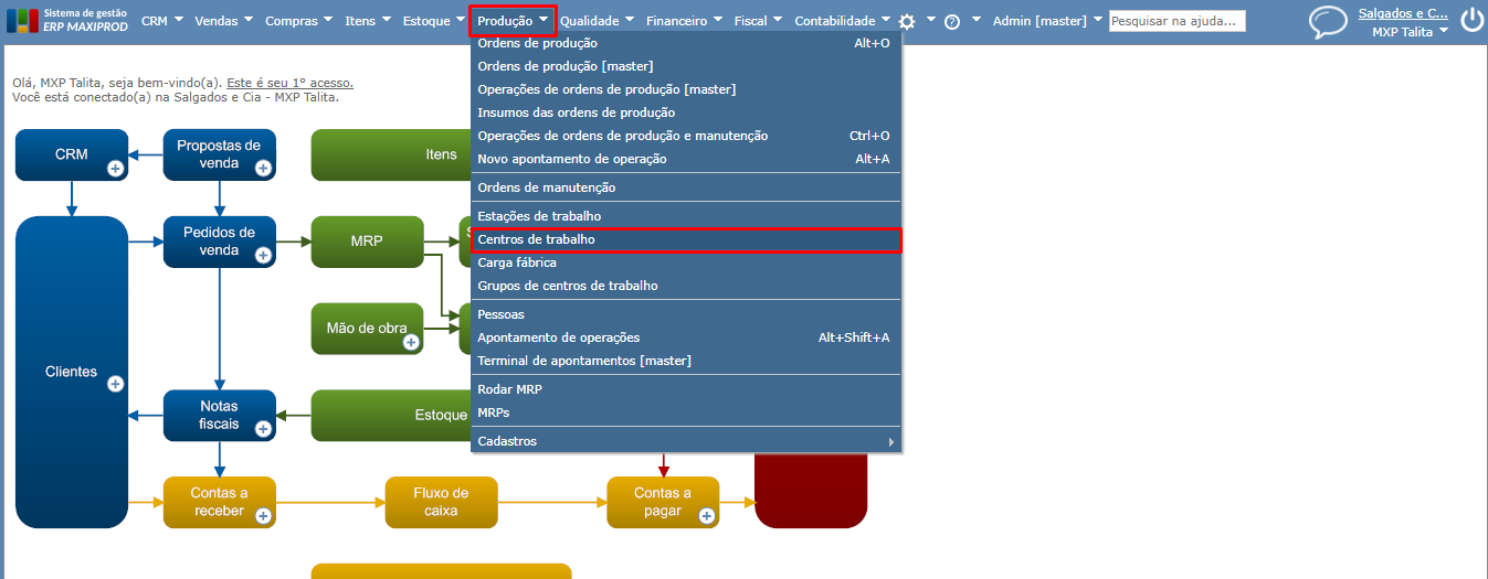 a) Acesse o menu “Produção > Centros de trabalho”.
