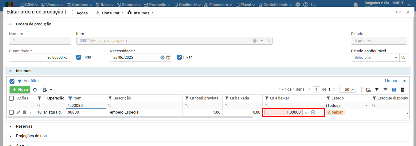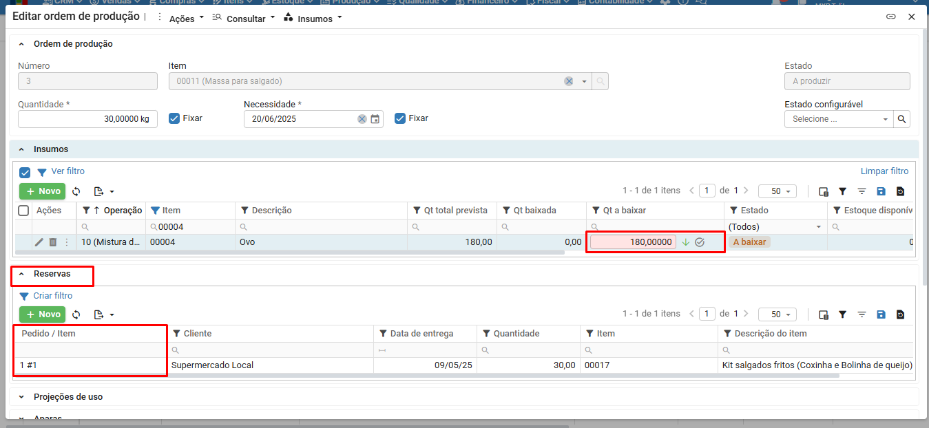 1) Acesse menu “Produção > Ordens de produção” e abra a referida ordem de produção clicando no ícone de lápis. Veja a reserva exibida na seção “Reservas” da ordem de produção.