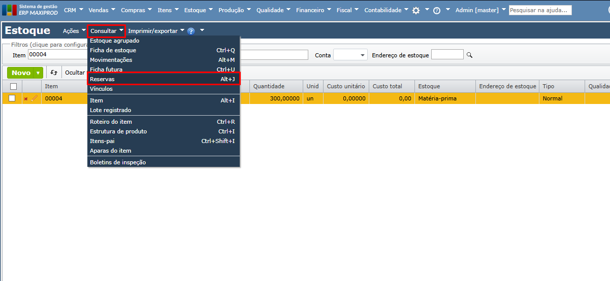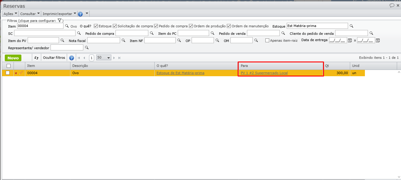3) No filtro “Item”, busque o código do insumo. Com o registro selecionado, clique em “Consultar > Reservas”. Também é possível acessar a tela de reservas pelo menu “Estoque > Reservas” e filtre pelo código do item.