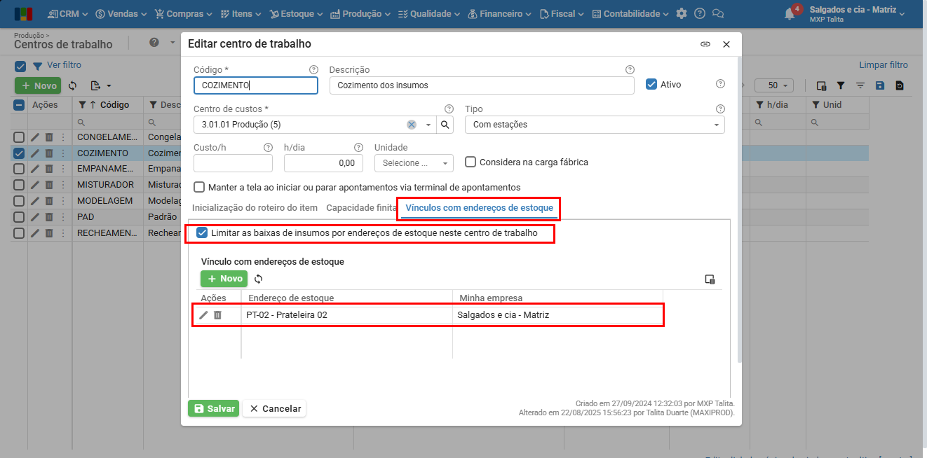 4) Por outro lado, é possível remover o vínculo do centro de trabalho com o endereço de estoque, permitindo que a baixa dos insumos não dependa mais de um endereço específico ou criar um novo vínculo com o endereço atual do estoque. Para mais detalhes, clique aqui.