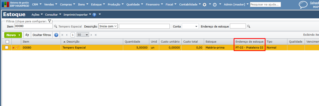 b) Pesquise pelo item e confira a coluna “Endereço de estoque”.