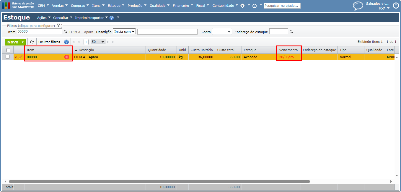 2) Procure o item usando o filtro “Item” e verifique as colunas “Item” e “Vencimento”.