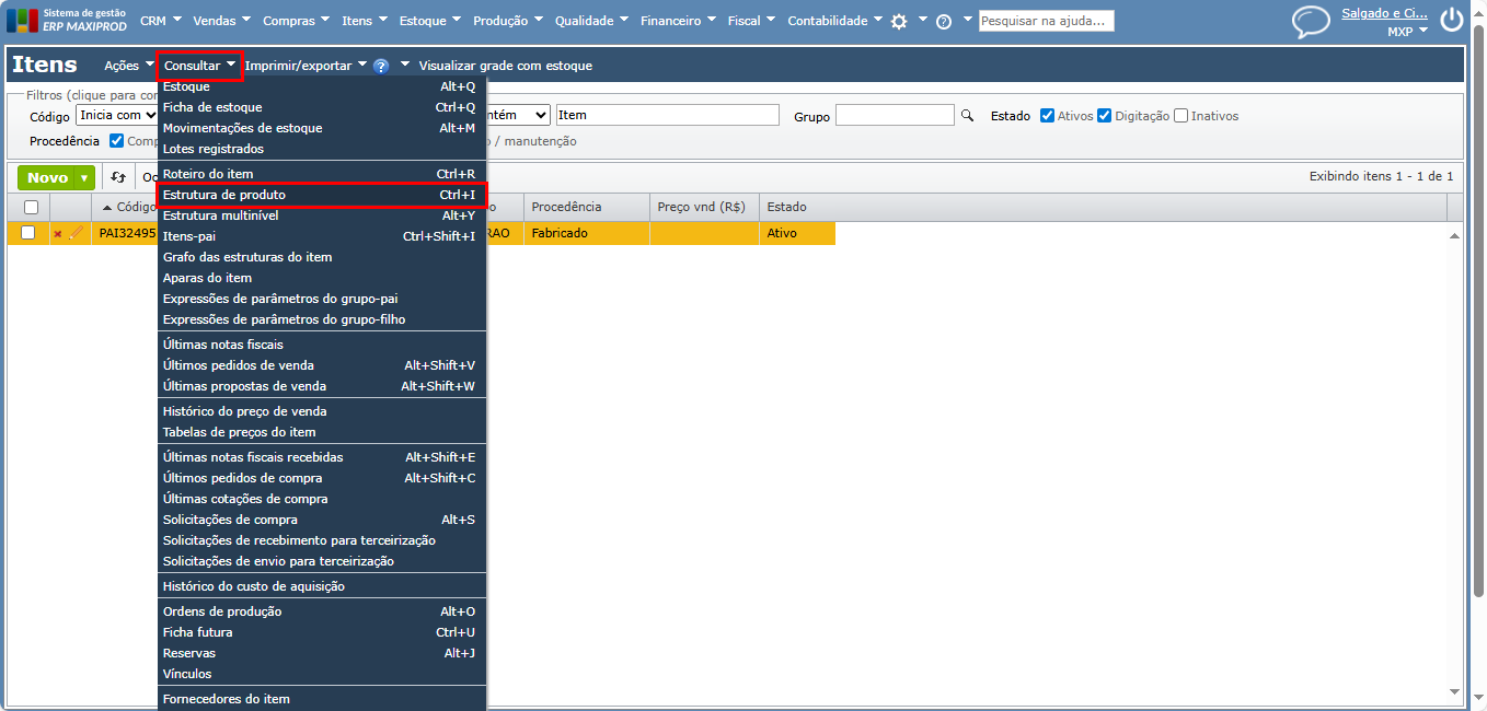 3) Pesquise pelo item-pai (item produzido pela OP). Selecione-o marcado em amarelo e em seguida acesse o menu “Consultar > Estrutura de produto”.