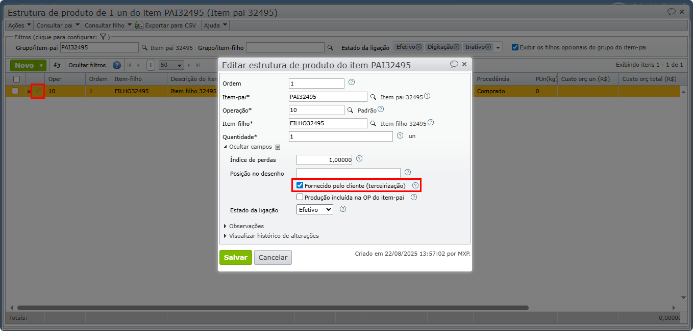 4) Altere a ligação do item-filho fornecido por terceiros, clicando no ícone de lápis e ative a opção “Fornecido pelo cliente (terceirização)”.