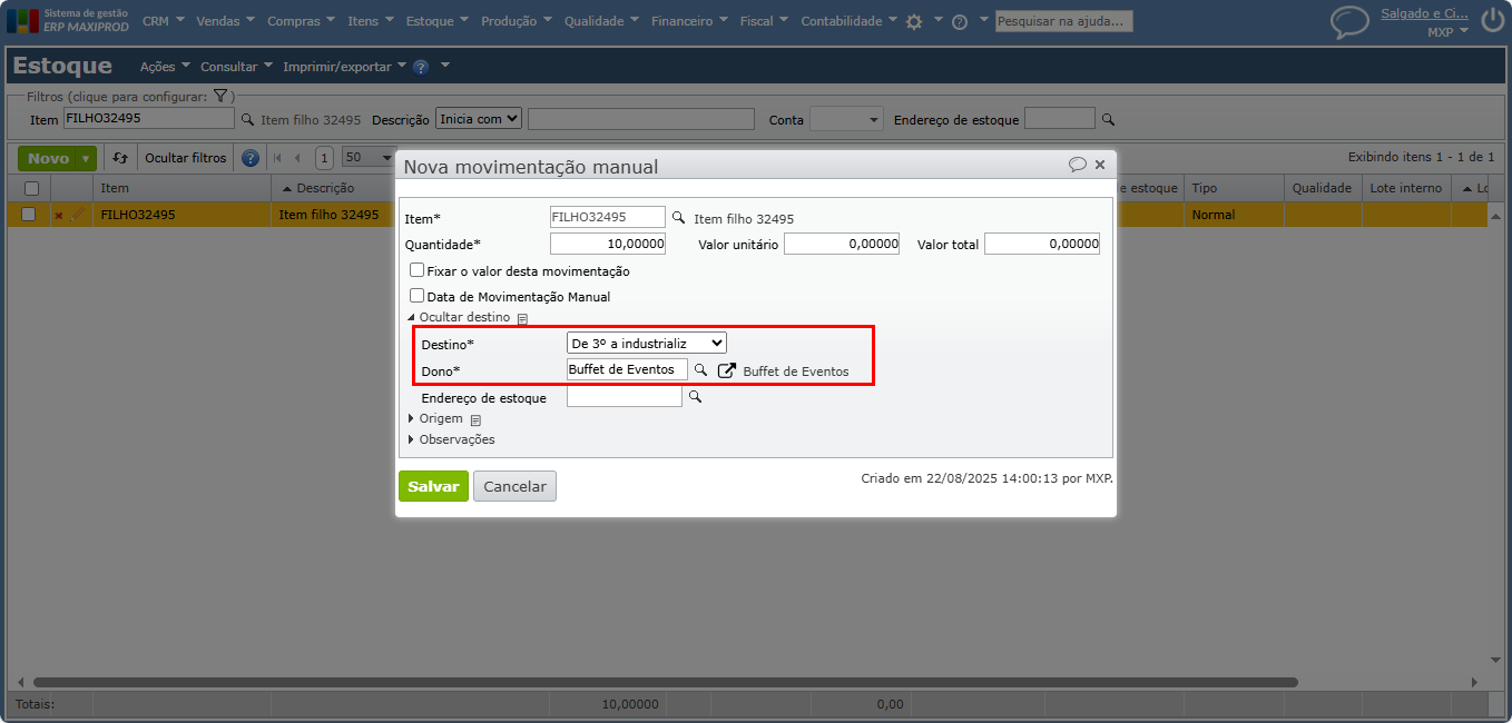 Importante: se a configuração “Item-filho fornecido pelo cliente (terceirização)” na estrutura de produto estiver correta, é necessário desfazer o recebimento da NFR de entrada do produto, corrigindo a NF, ou fazer uma movimentação manual desse estoque para um estoque de terceiros. Para fazer a movimentação manual acesse a tela “Estoque > Estoque”, selecione o estoque a alterar e acesse o menu “Ações > Nova movimentação manual”. A seguir, corrija os campos “Destino” e “Dono”.