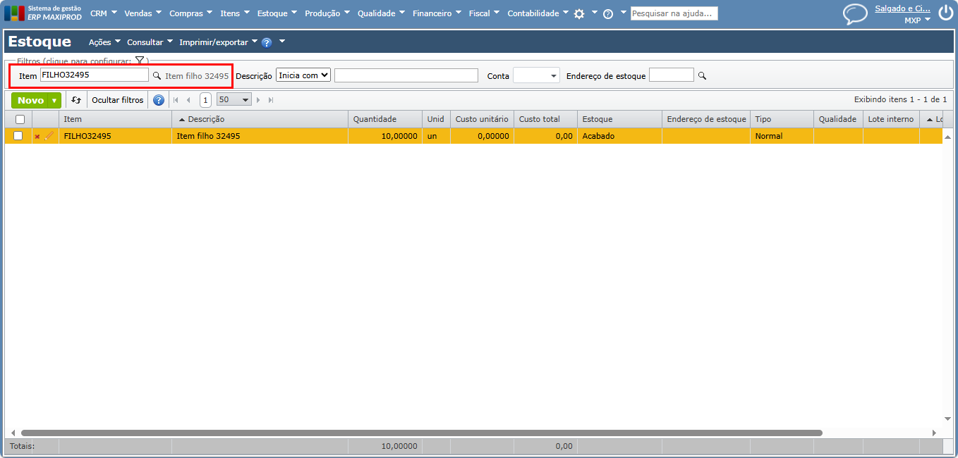 1) Acesse o menu “Estoque > Estoque” e filtre pelo código do insumo, utilizando o filtro “Item”.