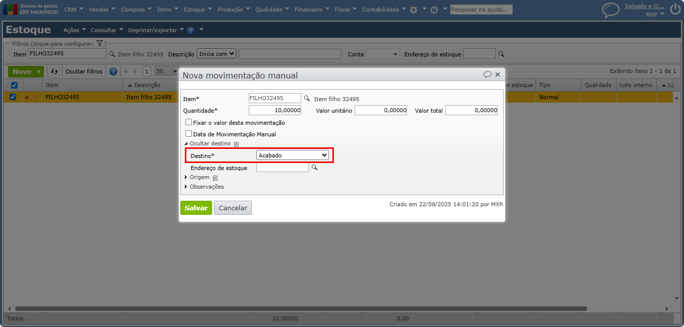 3) Se o endereço de estoque do item for diferente do endereço vinculado ao centro de trabalho, é possível realizar a movimentação de estoque para o endereço correto. Para mais orientações, clique aqui.