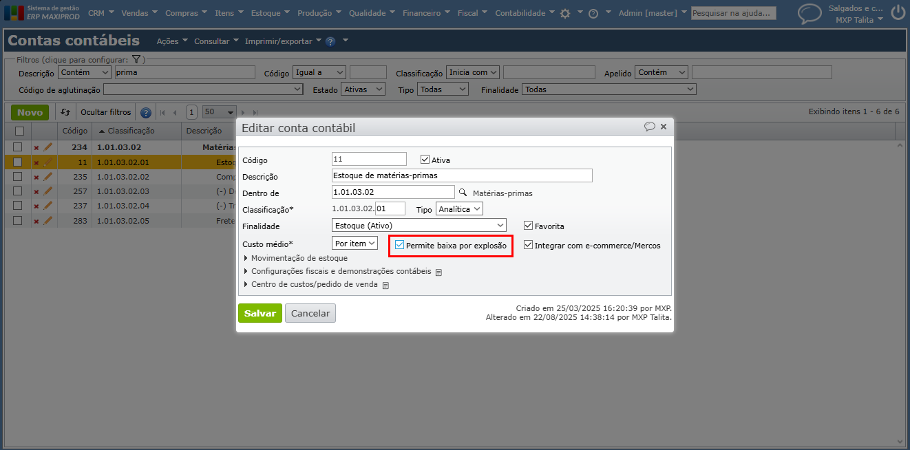3) Na tela de edição da conta contábil de estoque ative a opção “Permite baixa por explosão” e clique no botão verde “Salvar”.