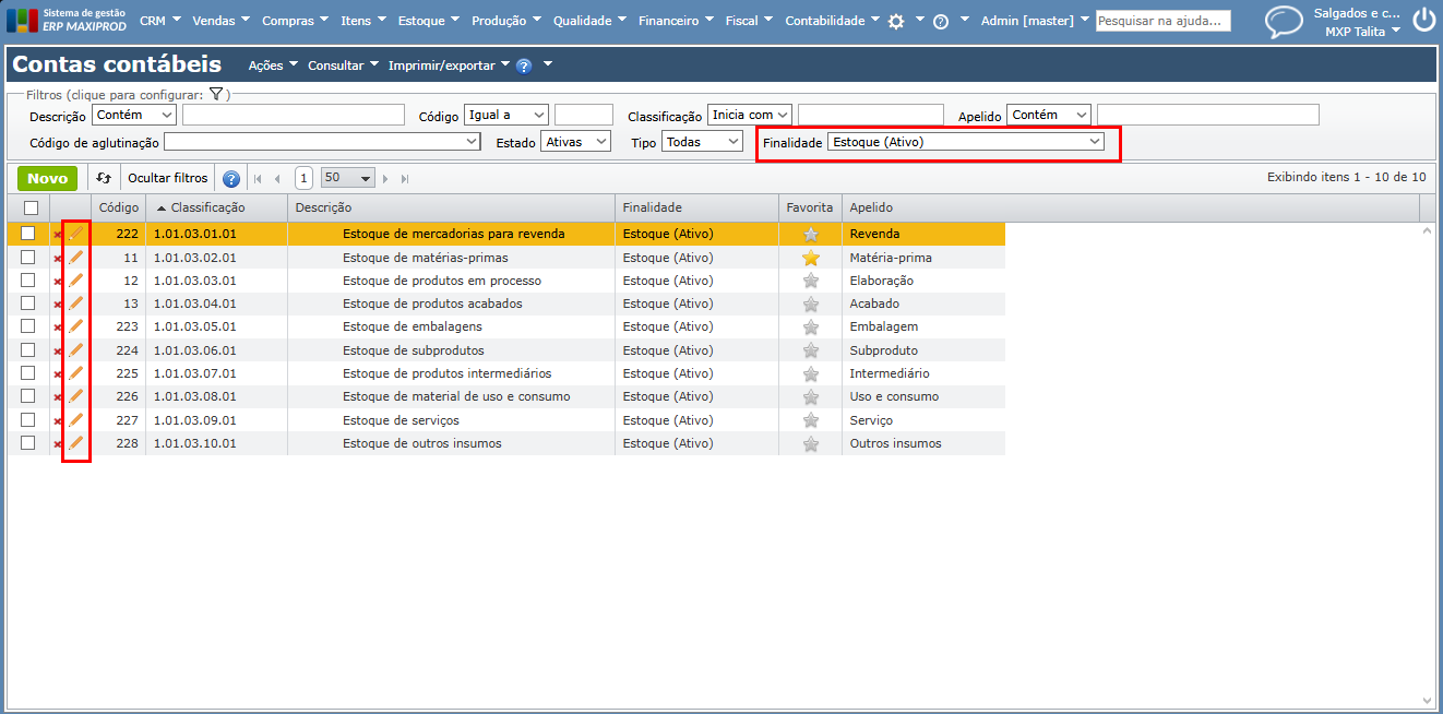 2) Altere o filtro “Finalidade” para “Estoque (Ativo)”, localize a conta contábil do estoque do insumo e clique no ícone de lápis para ajustar.