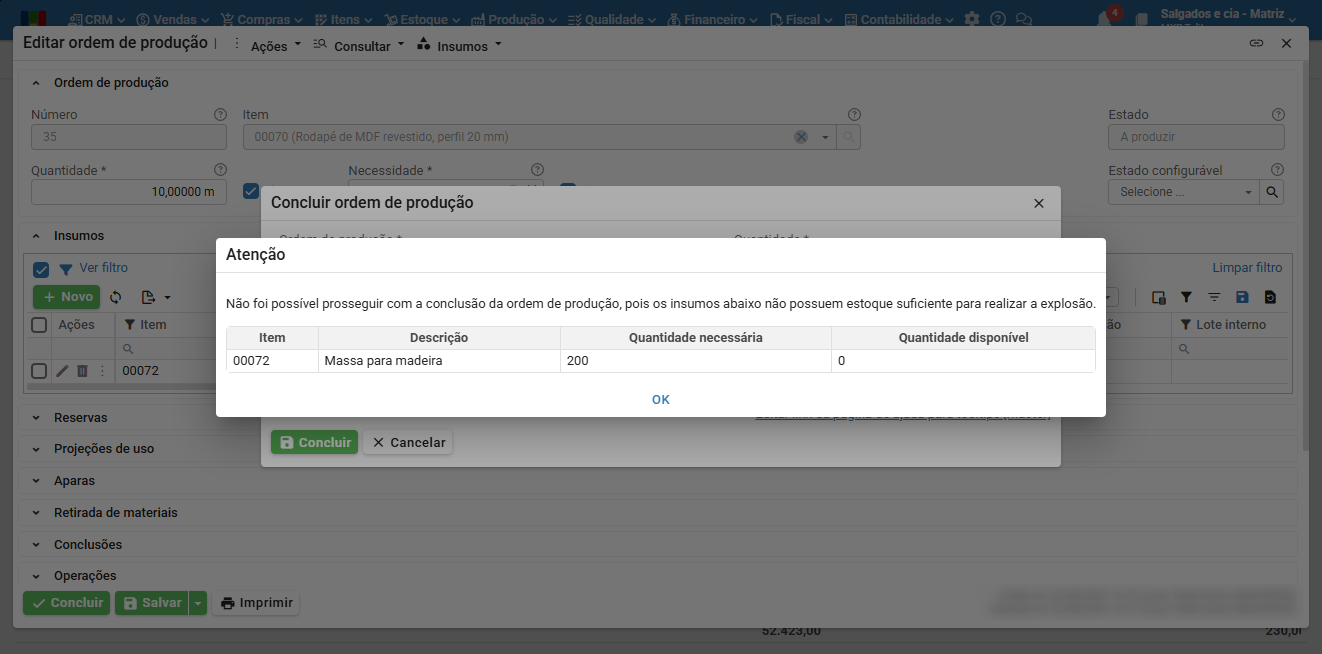 “Não foi possível prosseguir com a conclusão da ordem de produção, pois os insumos abaixo não possuem estoque suficiente para realizar a explosão.”