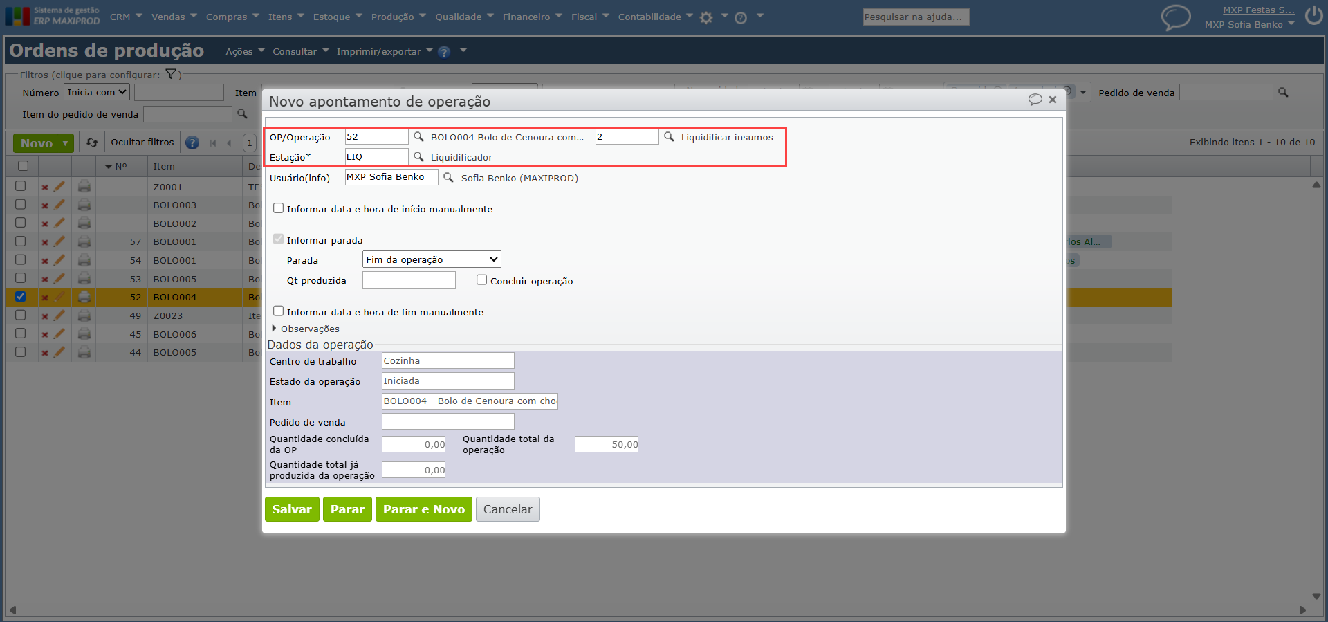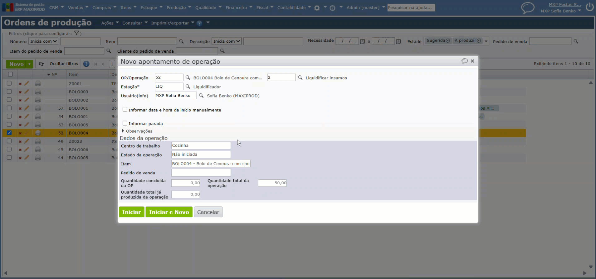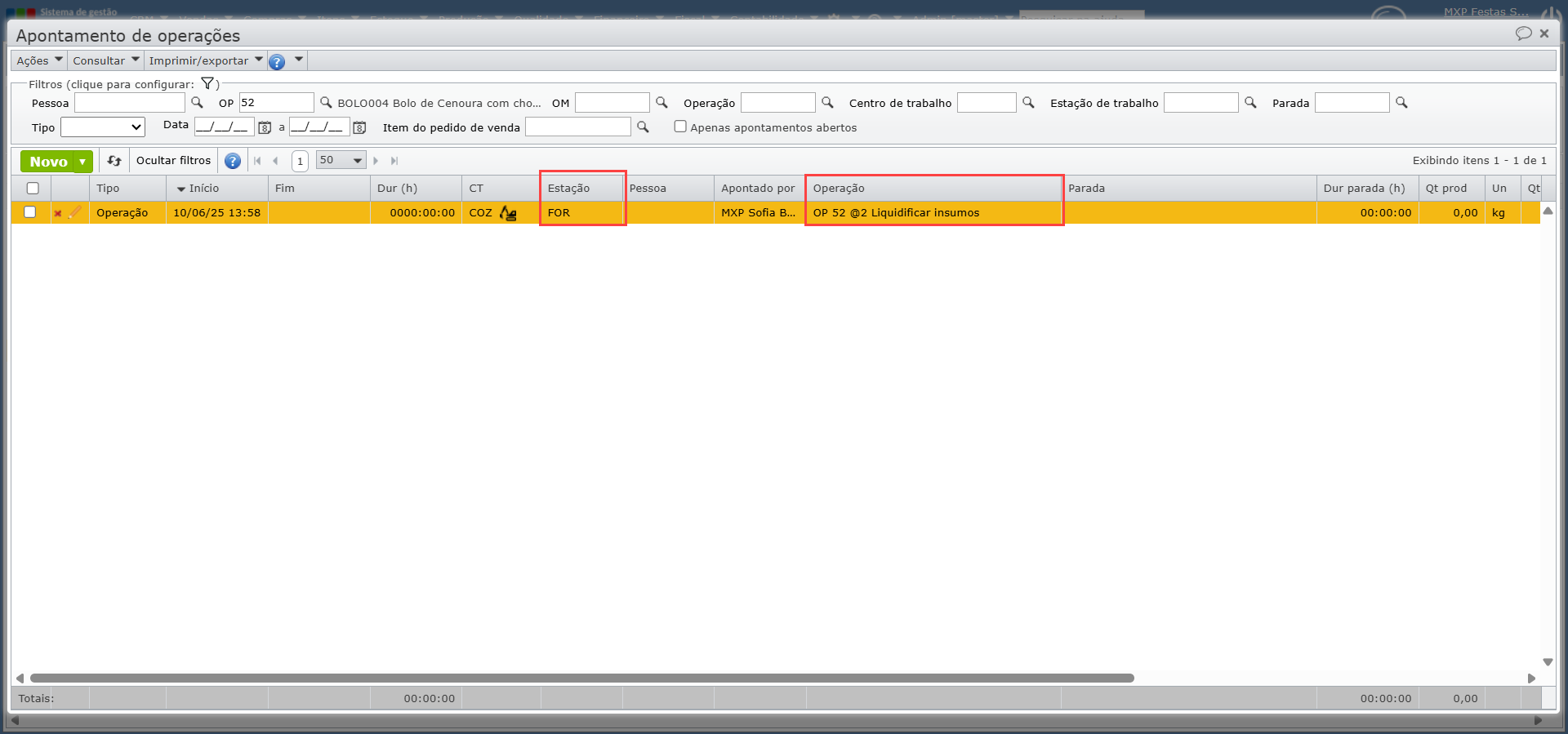 2) No exemplo acima, a operação “2 – Liquidificar insumos” está relacionada a estação de trabalho “LIQ – Liquidificador”. Ao utilizar o menu “Produção > Novo apontamento”, a estação será inicializada conforme a operação informada, como mostrado abaixo.