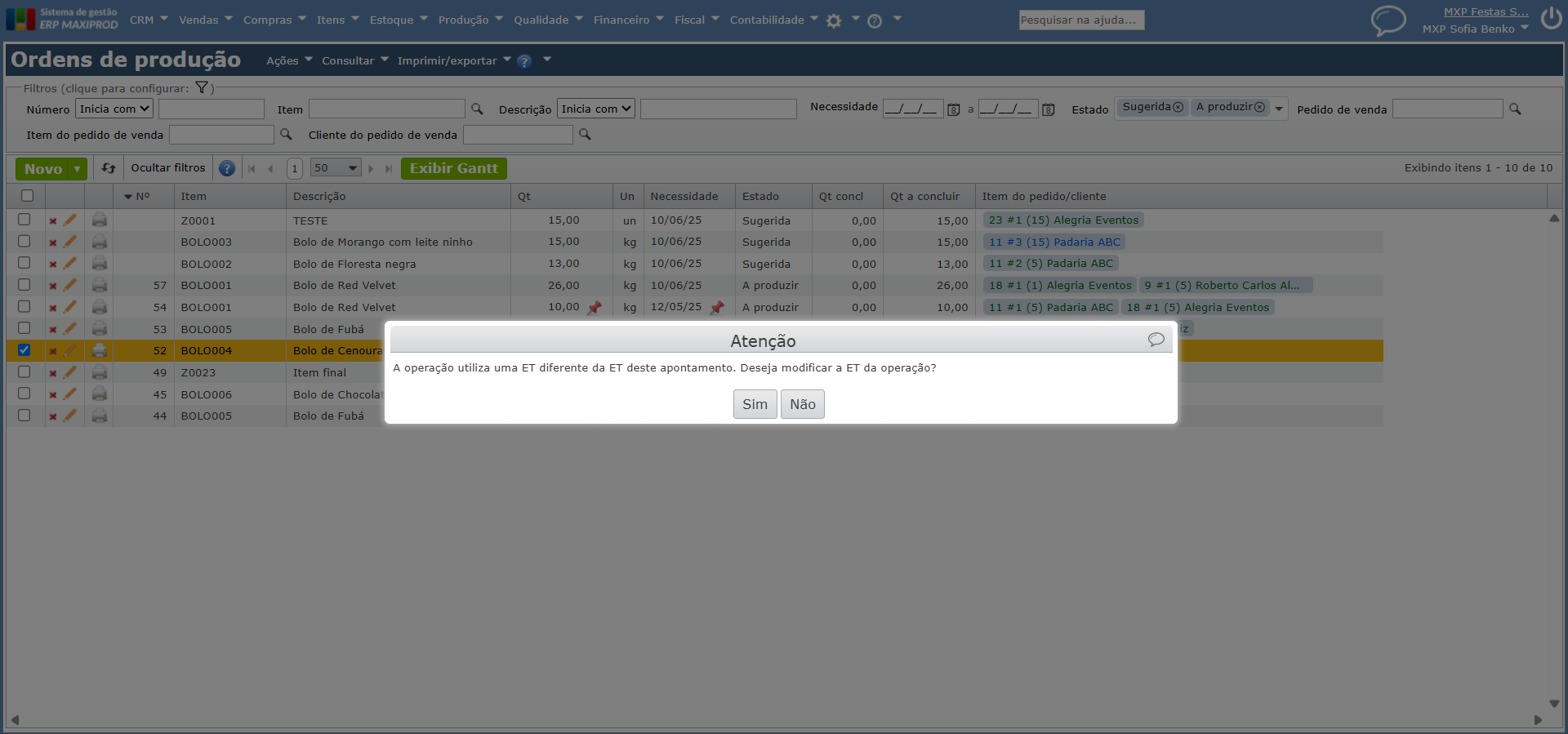 a) Caso clique em “Sim” na mensagem de confirmação exibida, a estação de trabalho do roteiro da ordem de produção será alterada para a estação informada no apontamento. Com isso, a mesma estação de trabalho do apontamento será a estação de trabalho da operação da OP.