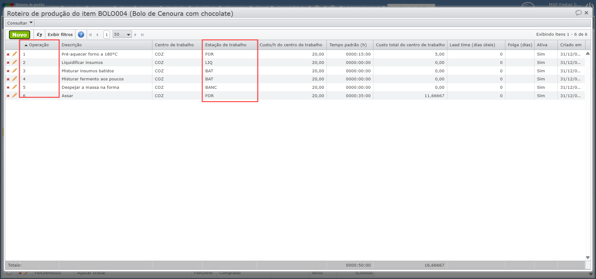 1) Na tela “Itens > Itens”, ao selecionar determinado item e acessar o menu “Consultar > Roteiro do item”, podemos conferir as operações, os centros de trabalho e suas respectivas estações de trabalho. As configurações do roteiro do item são inicializadas no roteiro das ordens de produção daquele item. Para saber mais sobre roteiro de itens, clique aqui.