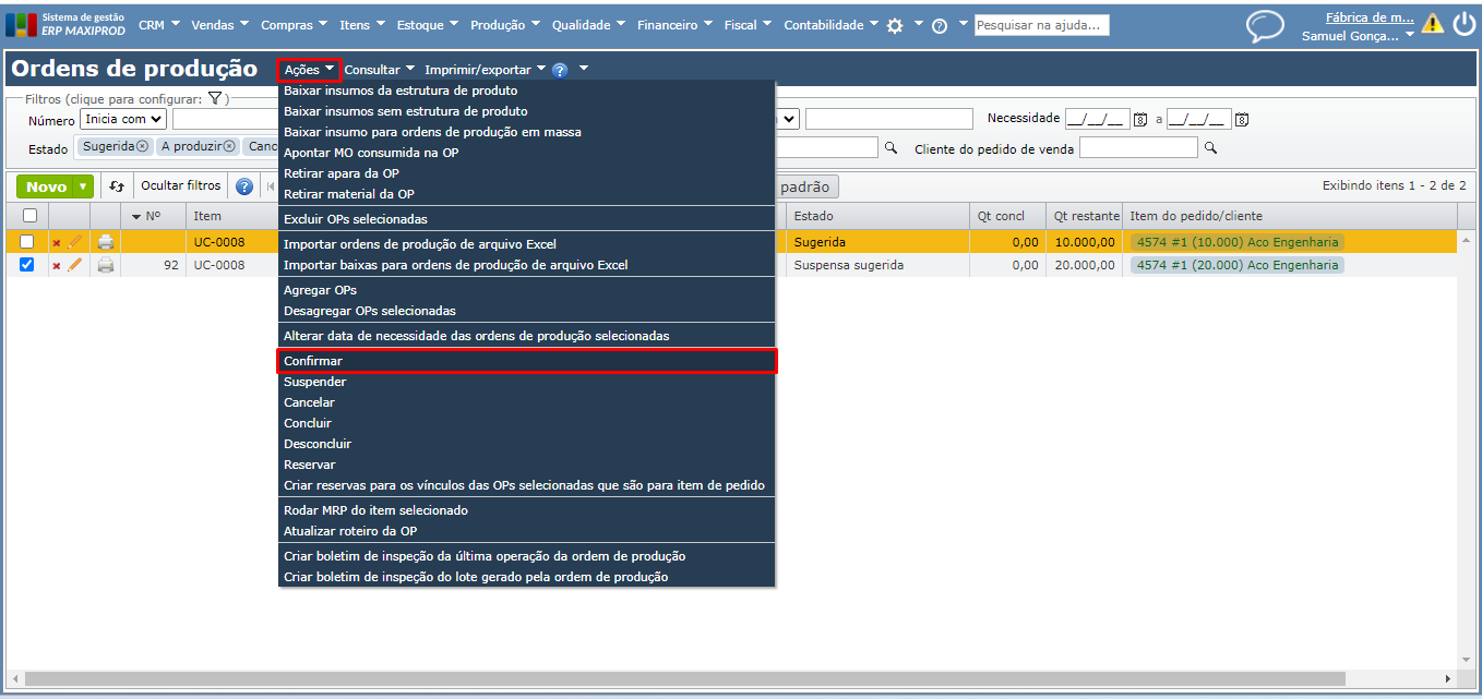 2) Para retornar uma OP suspensa ao estado “A produzir”, é necessário confirmá-la. Selecione-a na grade e acesse o submenu “Ações > Confirmar”.