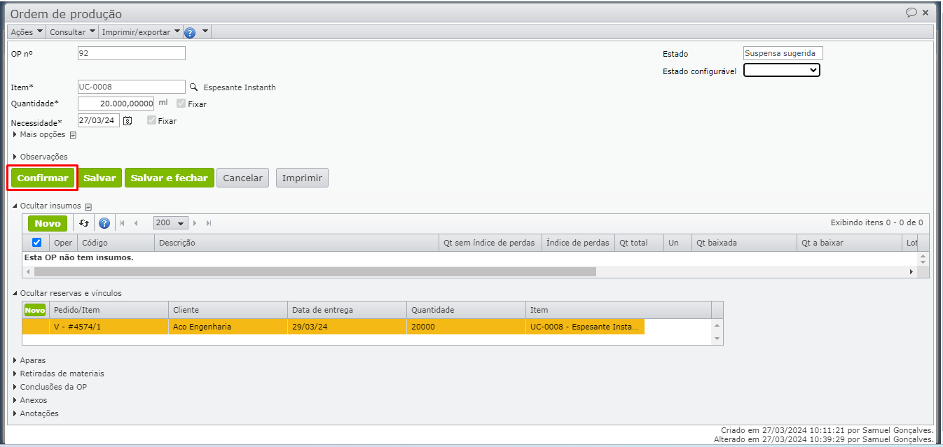 3) A confirmação pode ser feita pela própria janela de edição da OP, clicando no botão verde “Confirmar”.