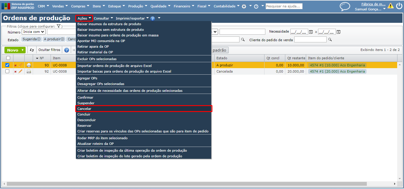 1) Para cancelar uma OP, selecione-a na grade e acesse o submenu “Ações > Cancelar”.
