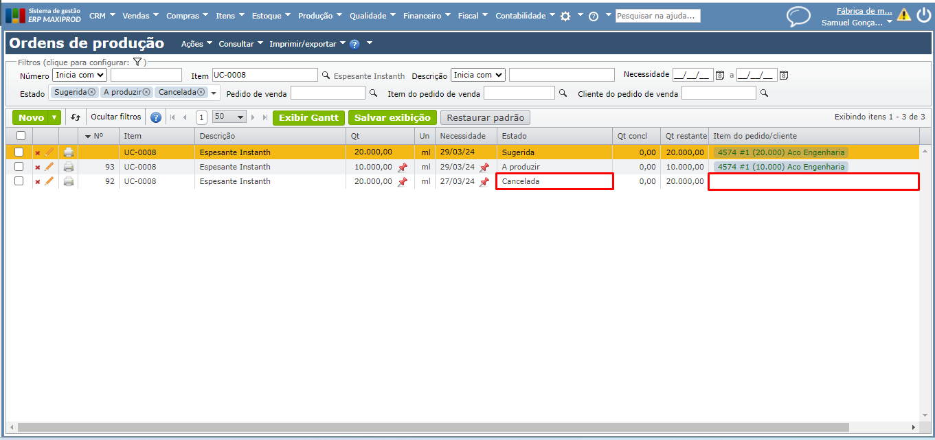 Estado “Cancelada”: ordens de produção canceladas não podem ser retornadas ao estado “A produzir”, tampouco podem ter insumos baixados ou operações iniciadas. O cancelamento de uma ordem de produção é definitivo. Uma OP só pode ser cancelada se não há insumos baixados ou operações concluídas.