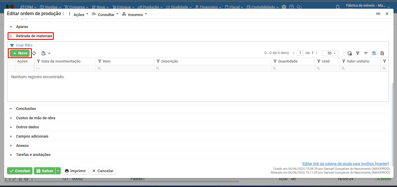 2) Realize a baixa dos insumos que serão retirados e, ainda na edição da OP, acesse a seção “Retirada de materiais” e clique no botão verde “Novo” para fazer as retiradas.