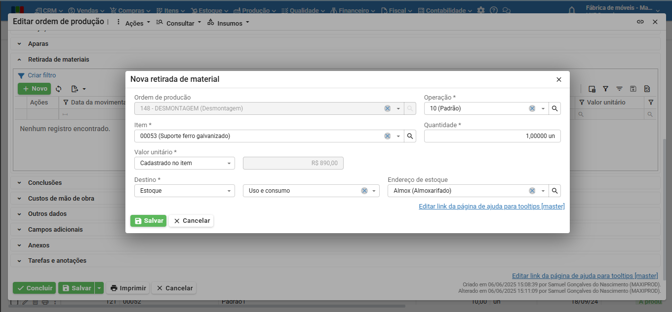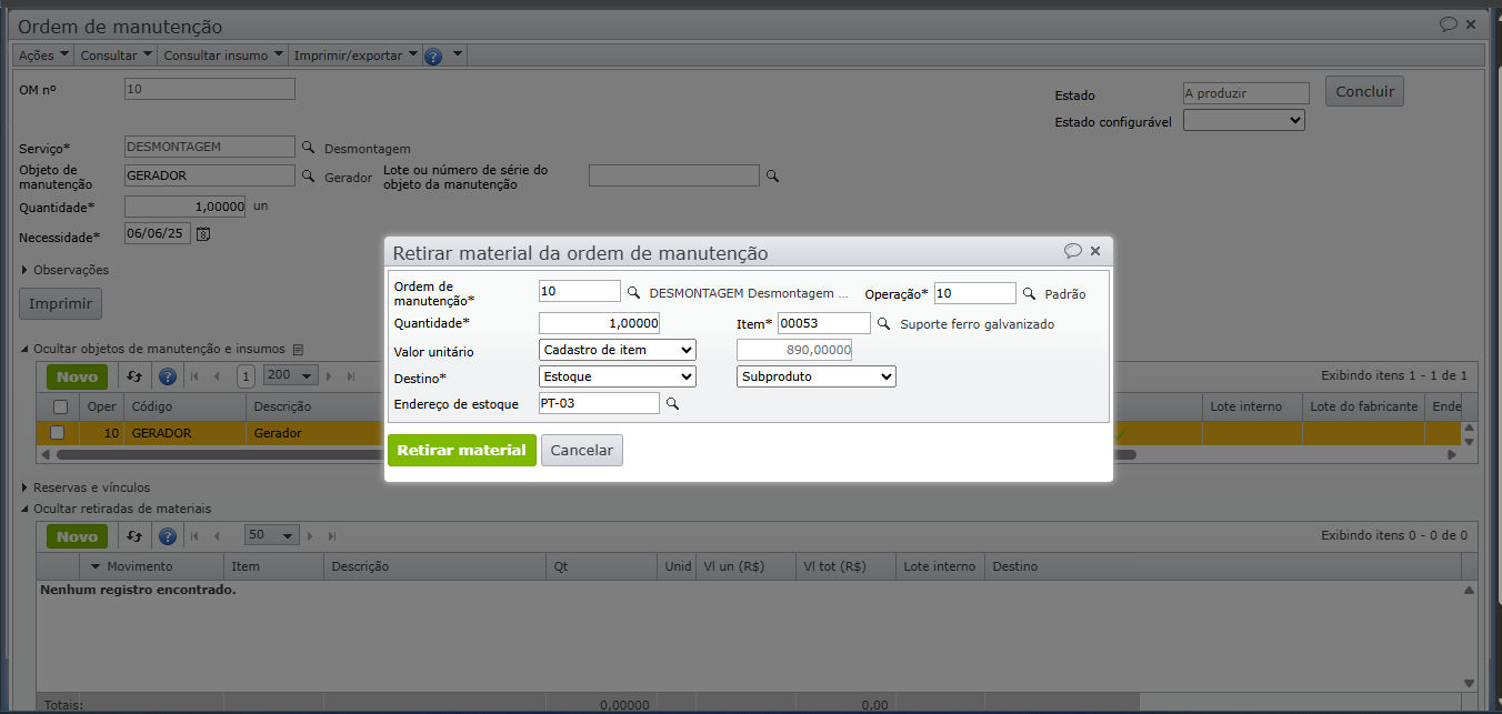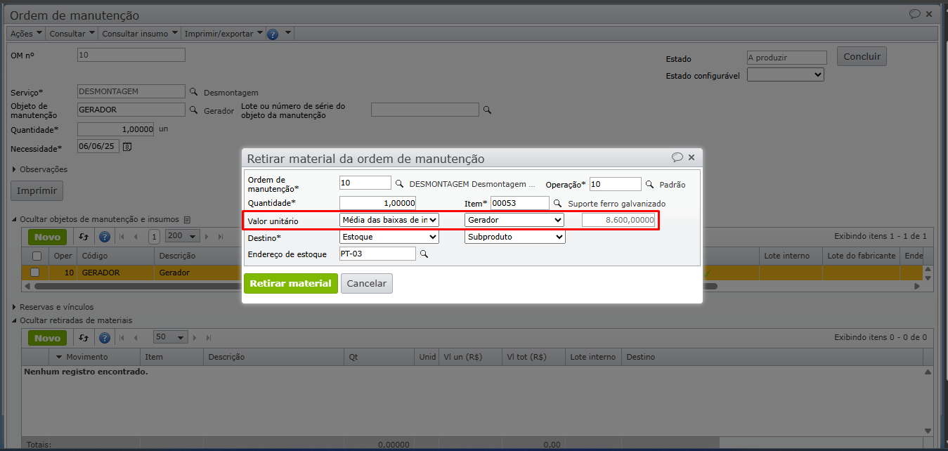 Ao fazer a retirada, o custo do item é subtraído do estoque em elaboração da OP ou OM e somado ao custo do estoque correspondente aos materiais retirados. Esta página mostra como retirar materiais de OPs e OMs, mantendo a integridade dos registros de estoque e custos.