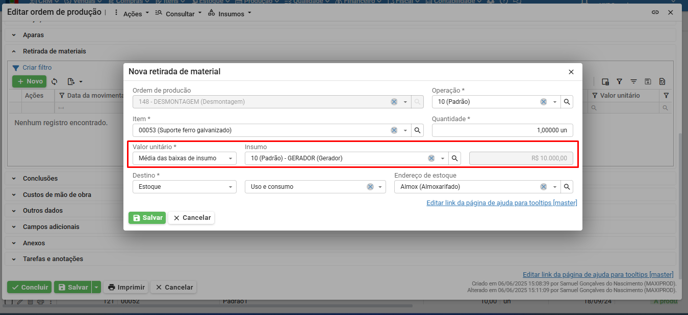 - Média das baixas de insumo: exibe um novo campo com a lista de todos os insumos já baixados para a OP. O valor unitário do item retirado será a média das baixas já realizadas do item selecionado no segundo campo.