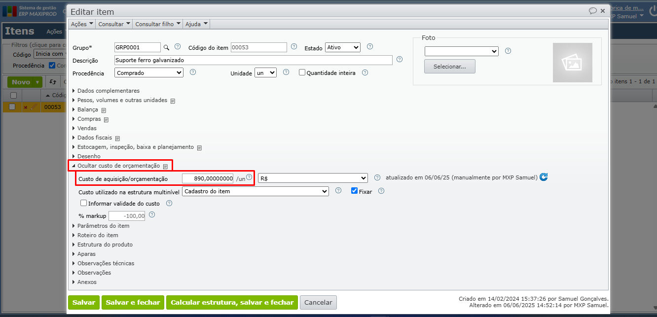 - Cadastrado no item: utiliza o valor do campo “custo de aquisição/orçamentação”, do cadastro do item.